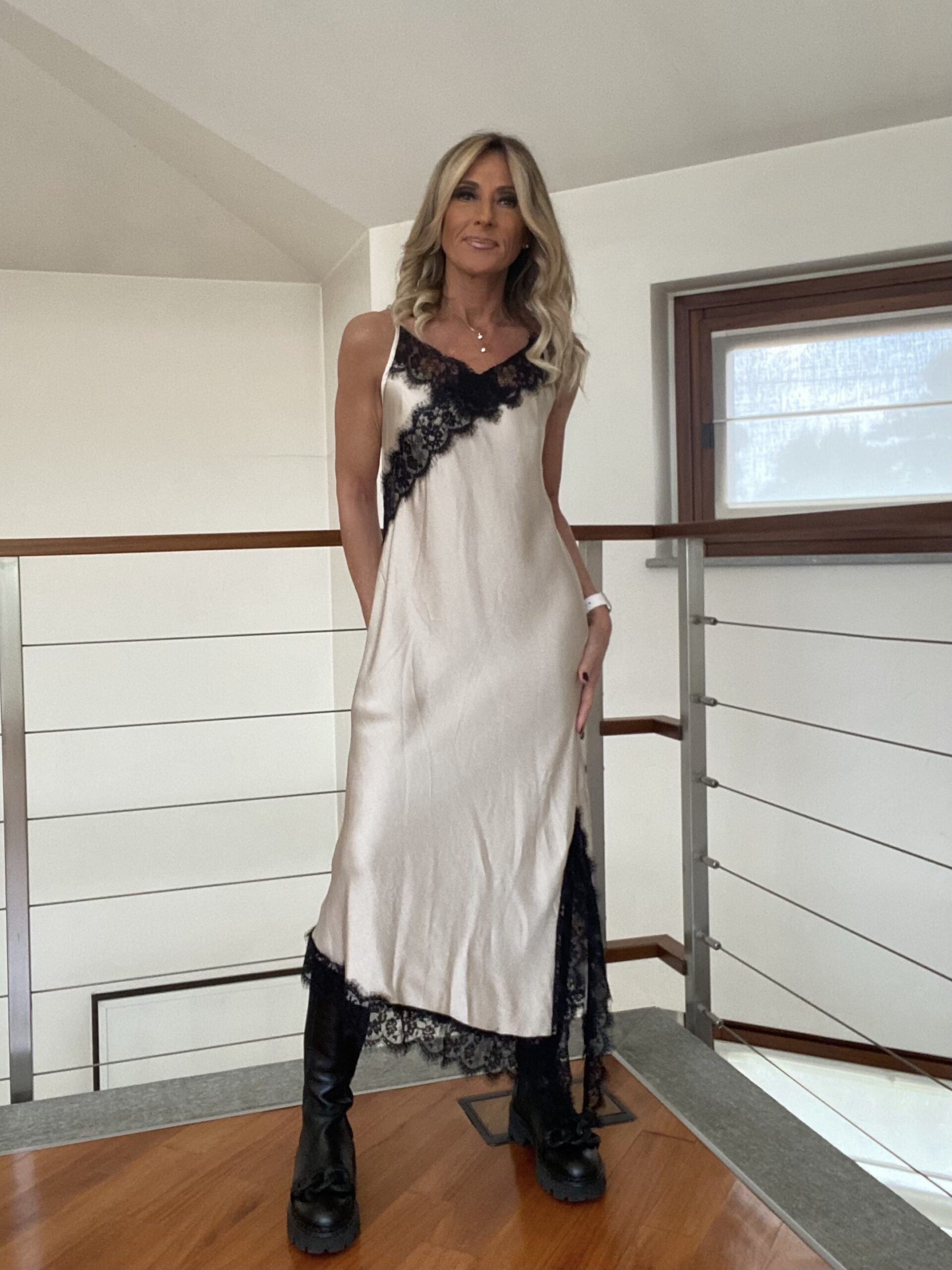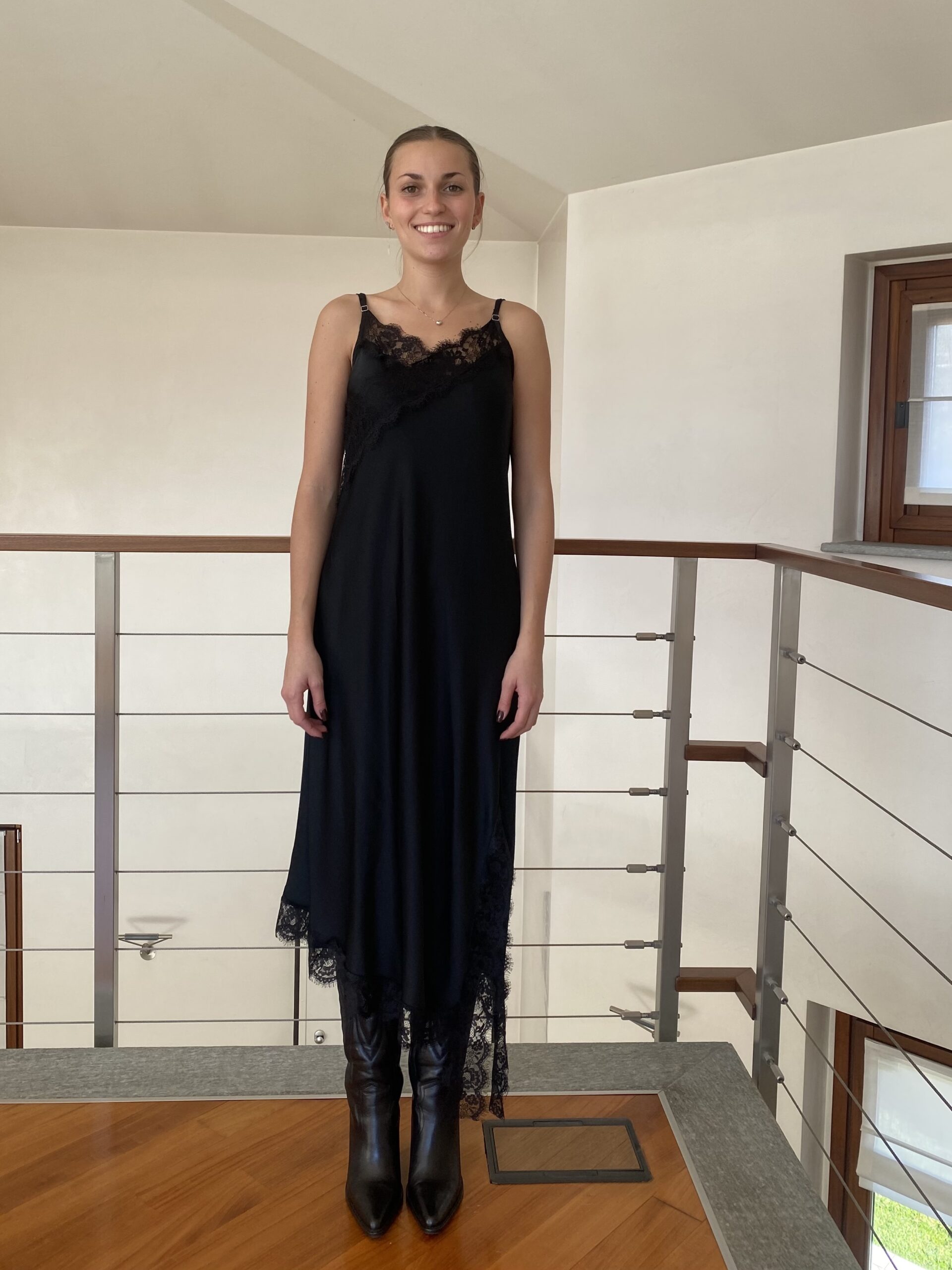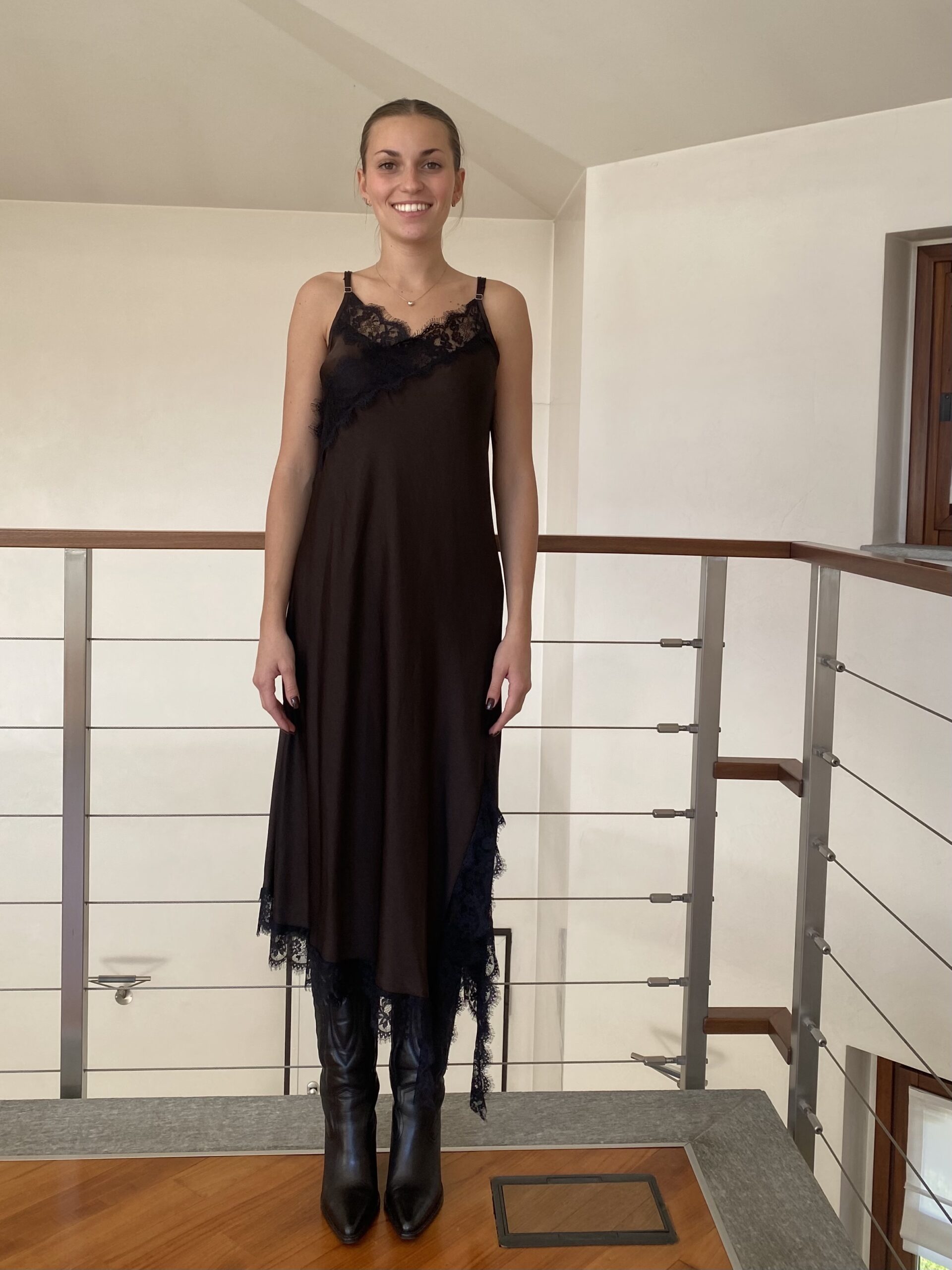 - Abito lungo asimmetrico in satin di viscosa con dettagli in pizzo a contrasto, scollatura a V, spalline sottili regolabili
