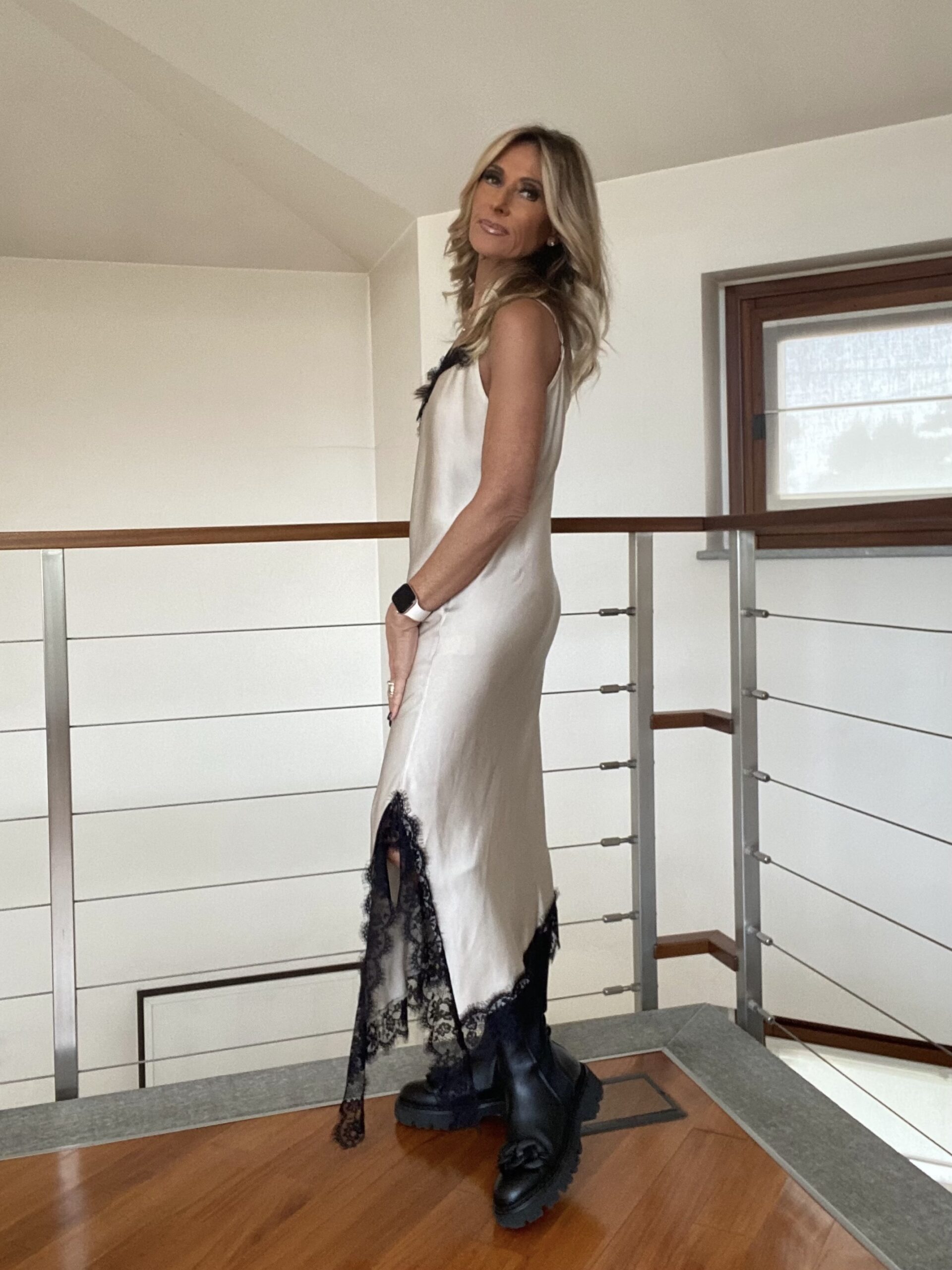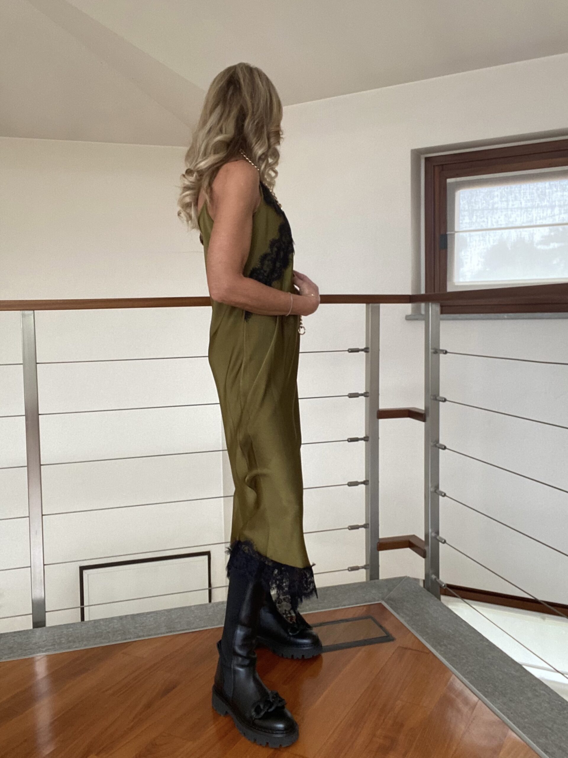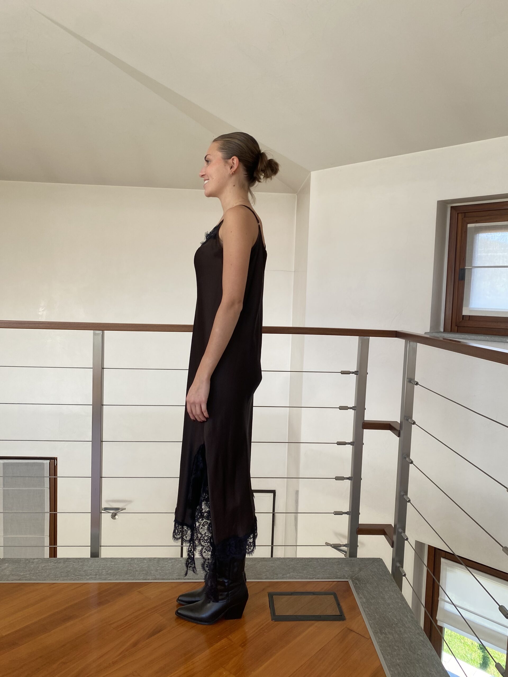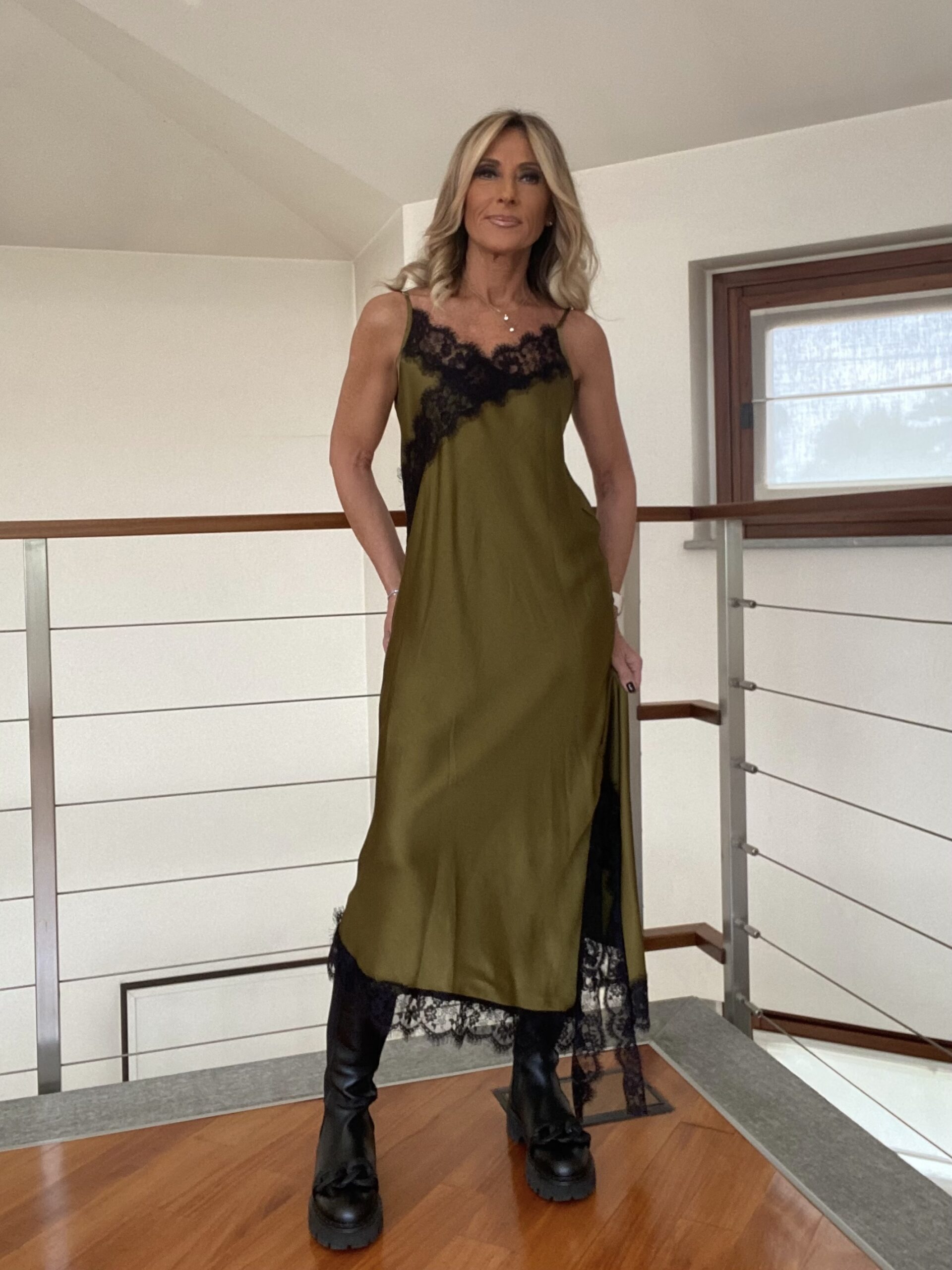 - Abito lungo asimmetrico in satin di viscosa con dettagli in pizzo a contrasto, scollatura a V, spalline sottili regolabili