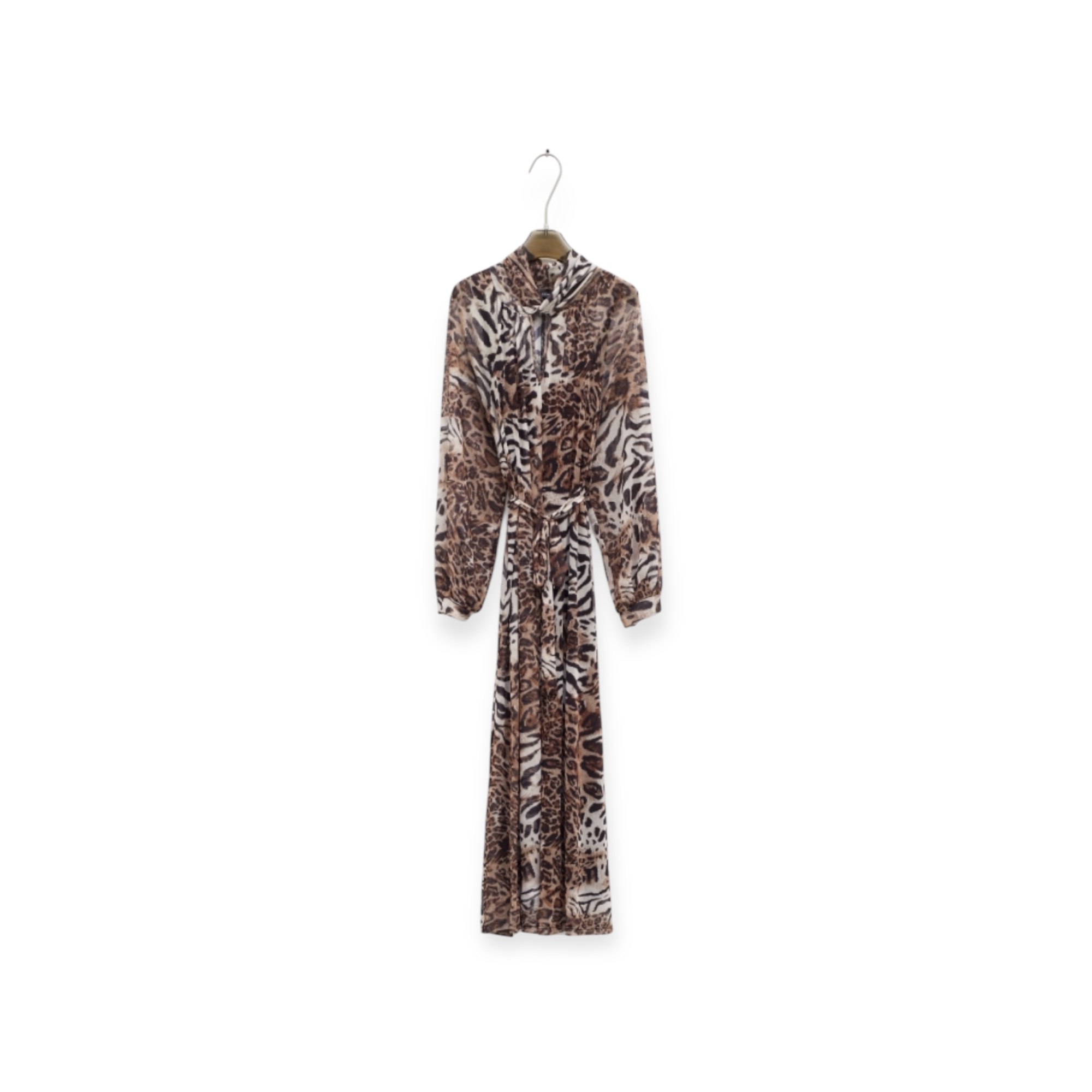 - Abito lungo in tulle elasticizzato a fantasia animalier, manica lunga, scollo morbido con arricciature, fodera interna