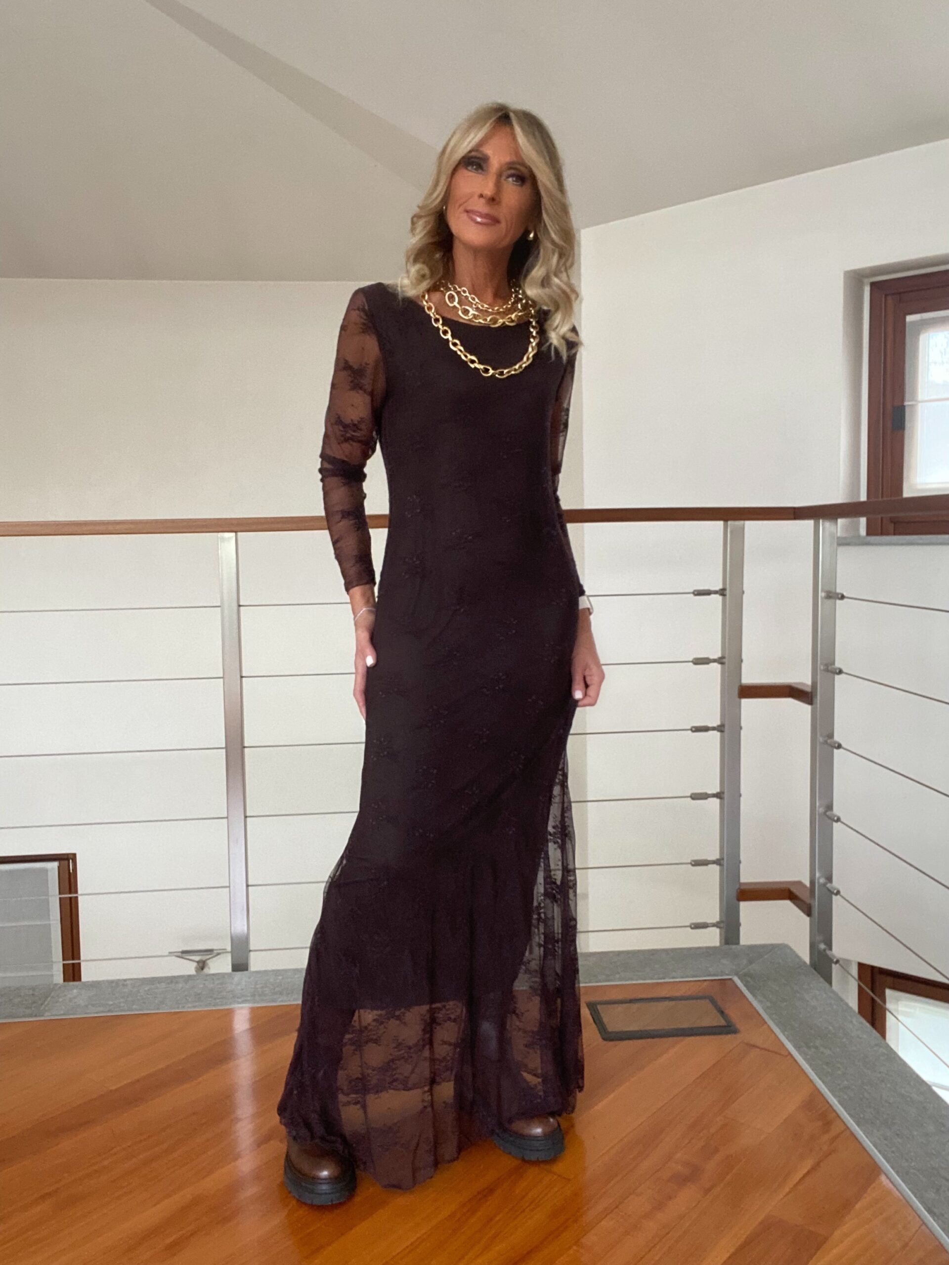 - Abito lungo in pizzo girocollo foderato con manica trasparente
