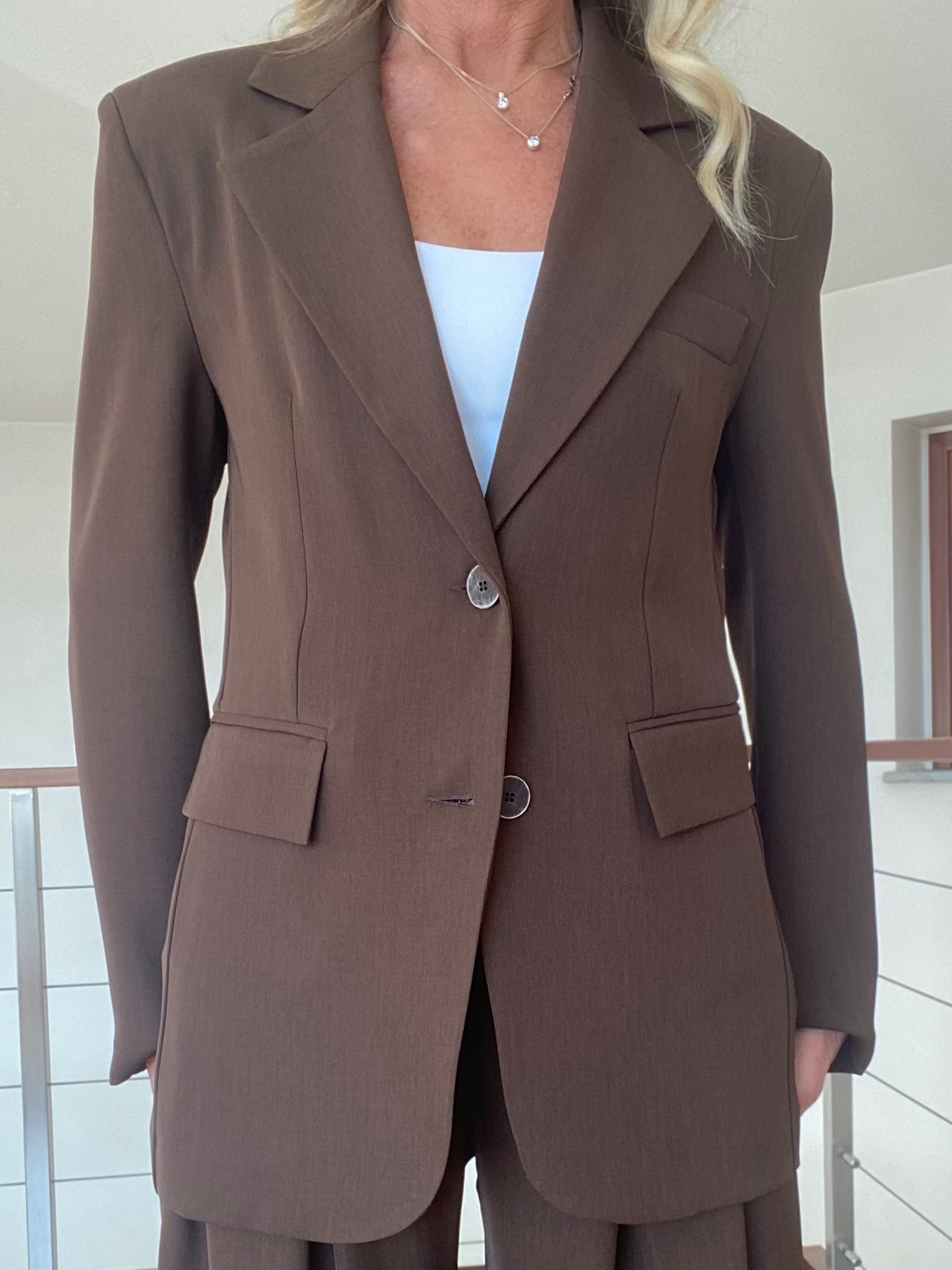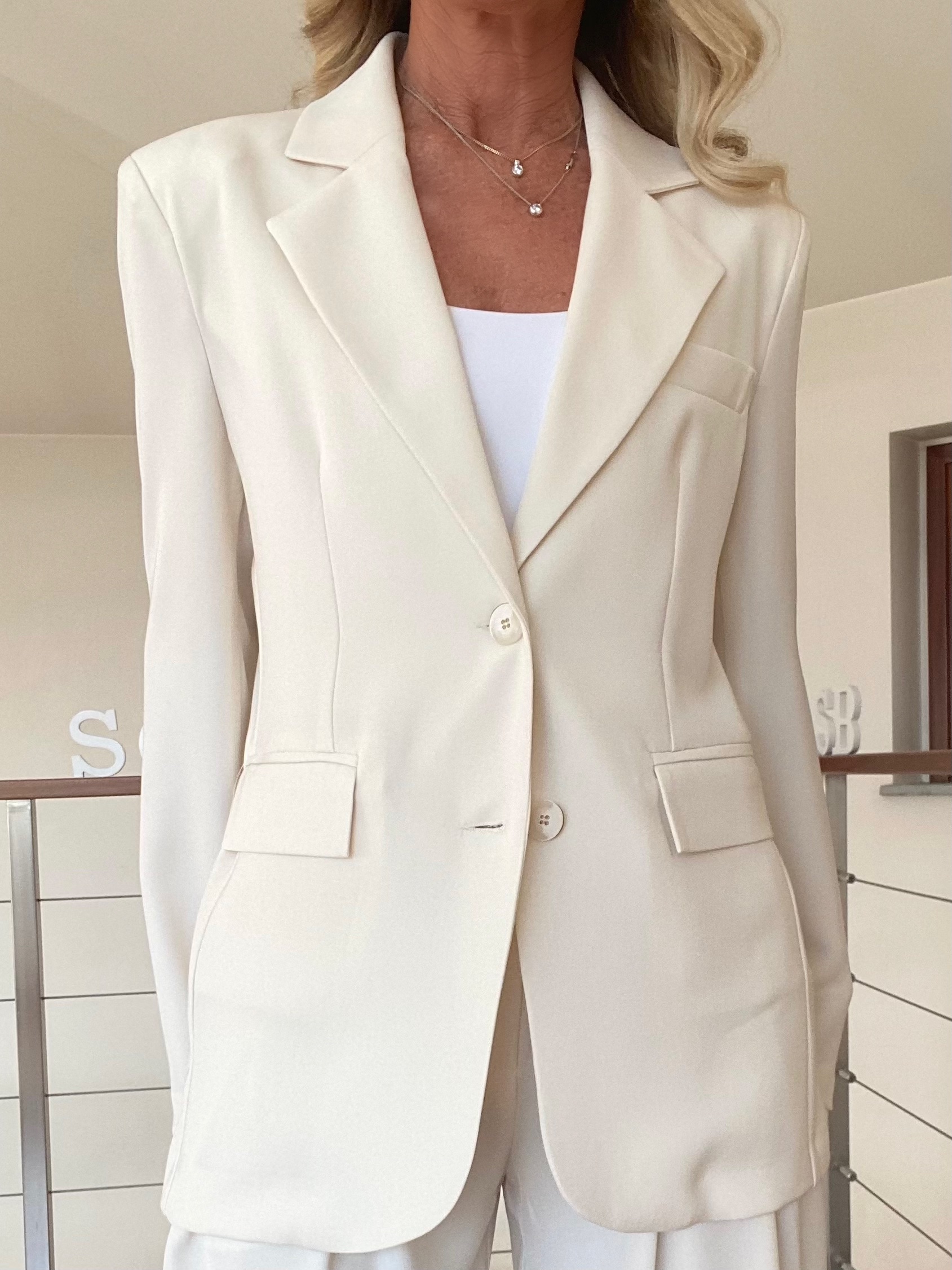 - Blazer lungo monopetto a due bottoni con spalla leggermente imbottita, tasche sul davanti sfoderato, spacco centrale sul retro, collo a rever