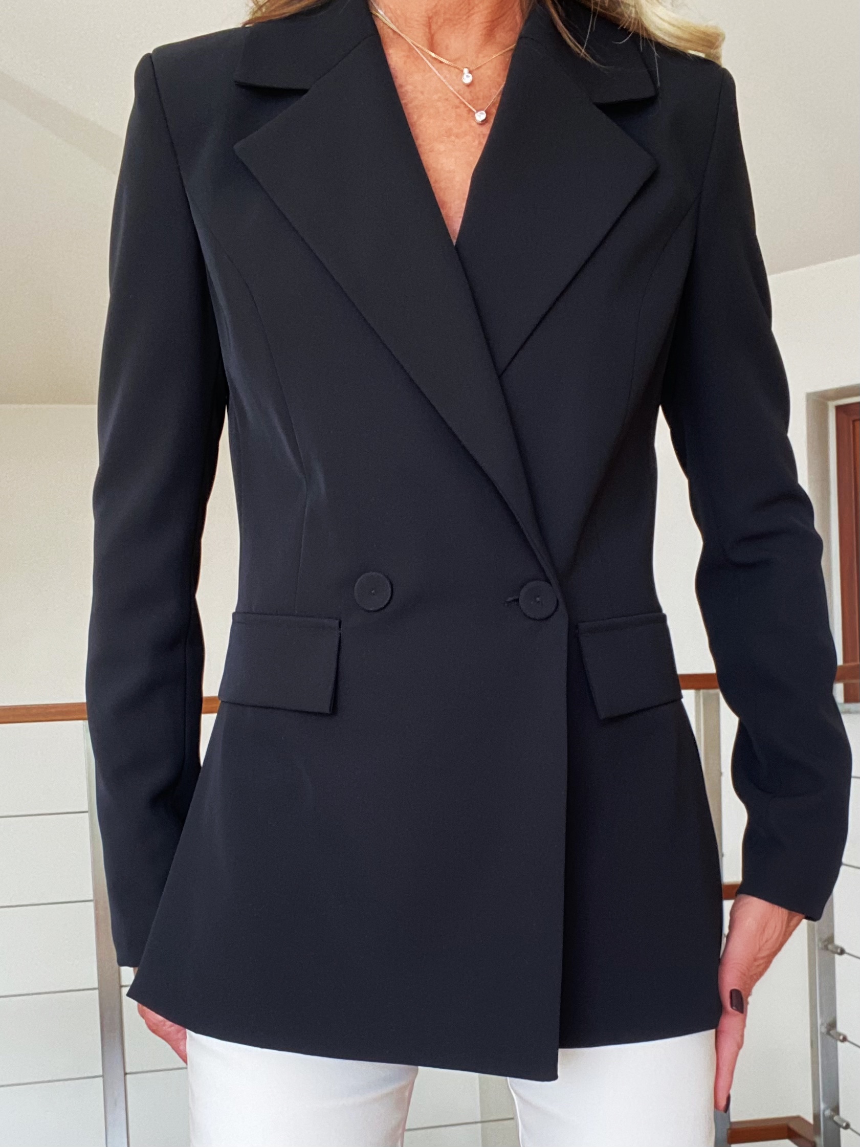 - Blazer doppiopetto nero in tessuto fluido con spacchi sui lati, leggermente avvitato