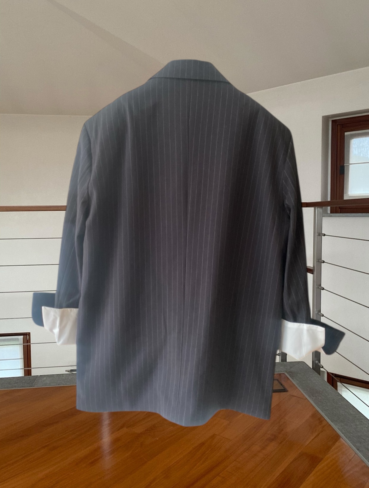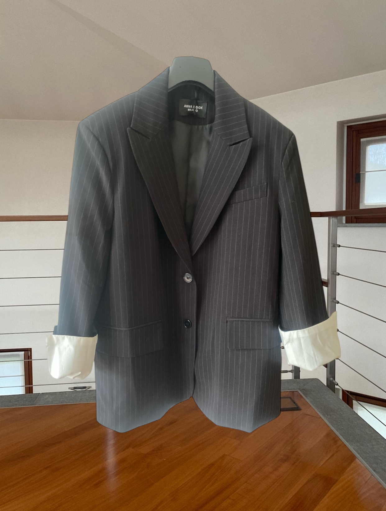 - Blazer gessato nero dalla vestibilità over con polsino bianco a camicia, chiusura monopetto 2 bottoni, tasche sul davanti