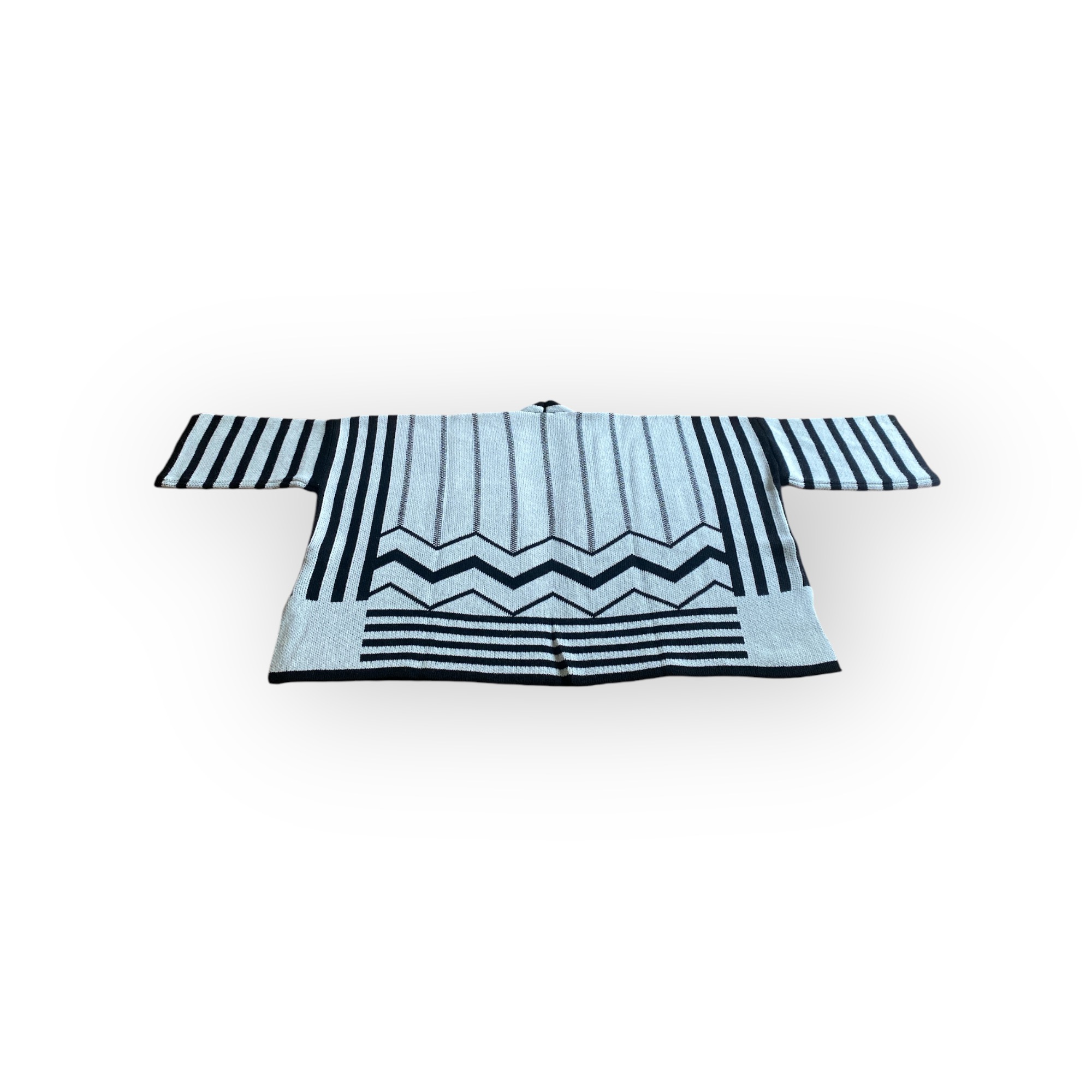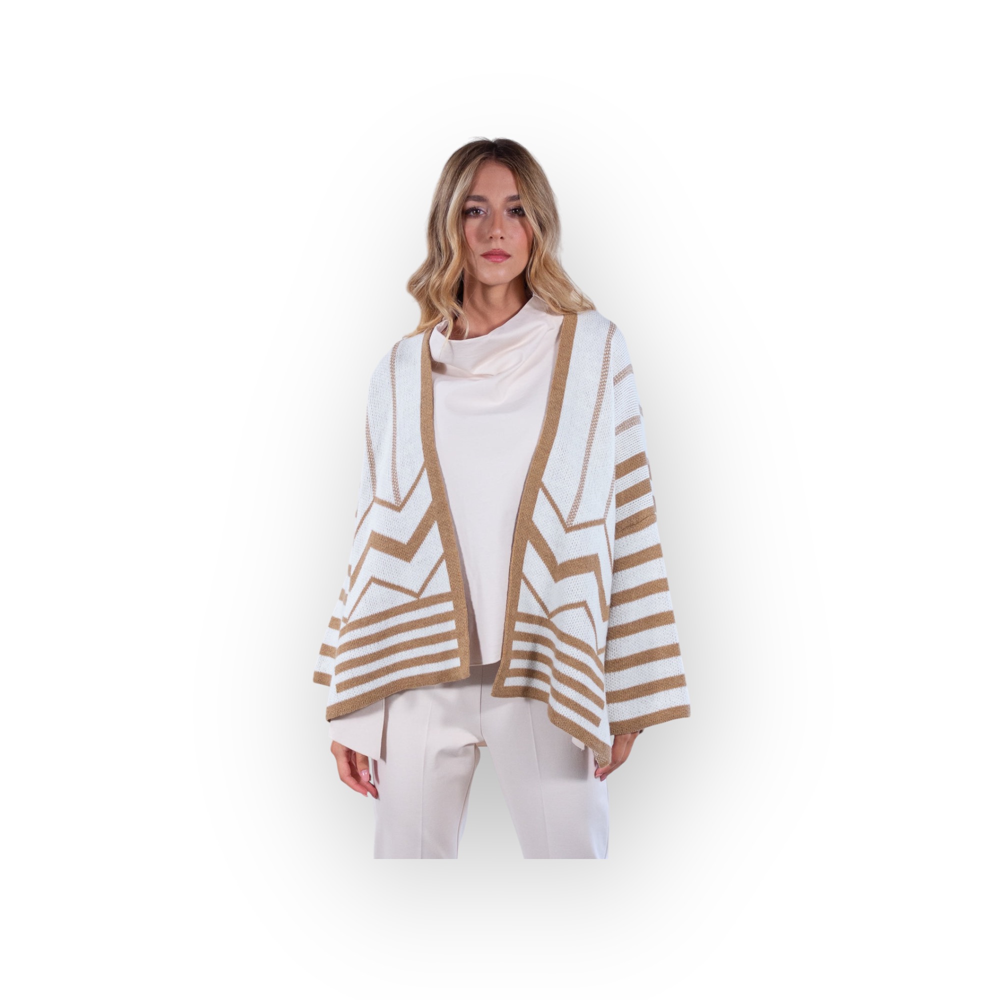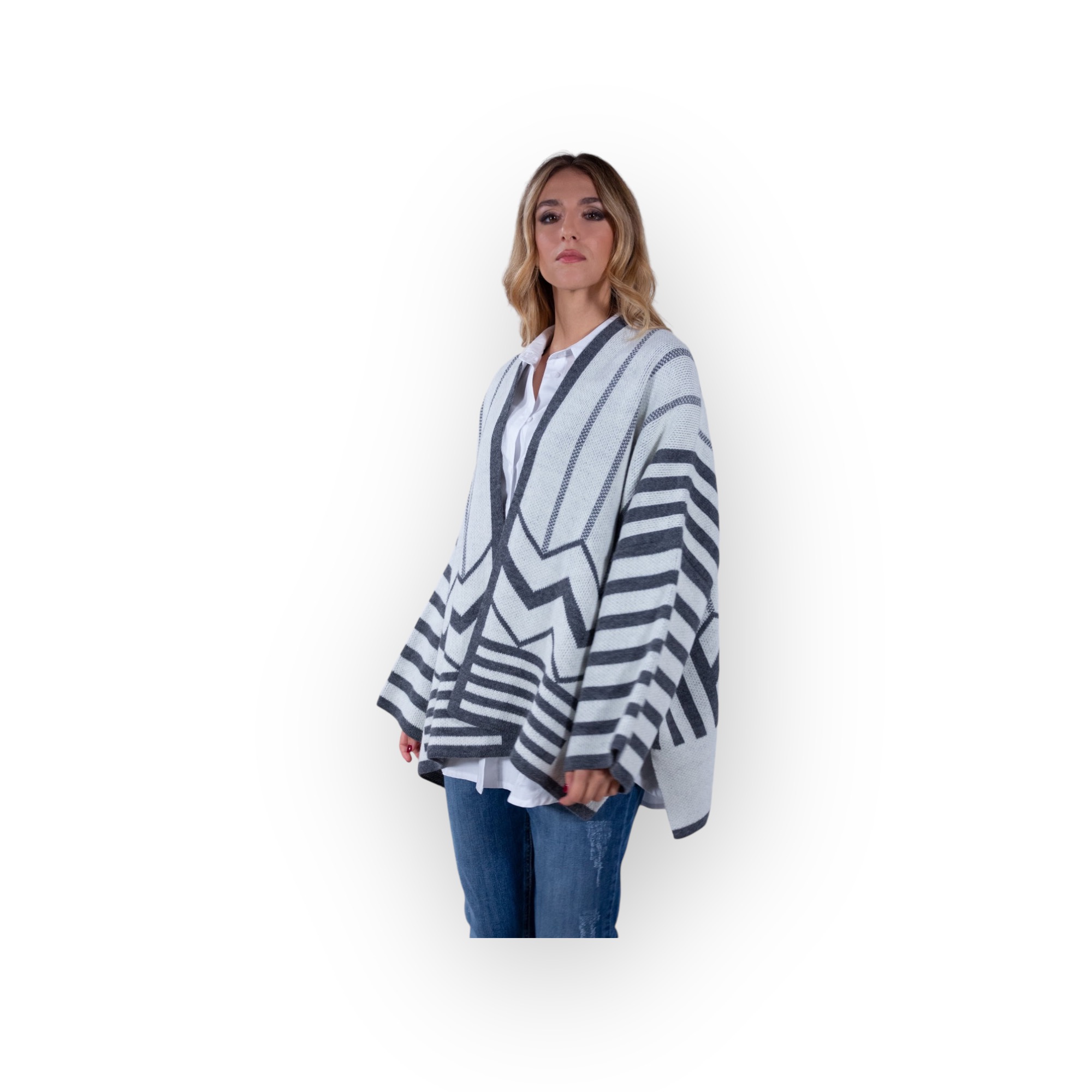 - Cappa bicolore jaquard a fantasia geometrica con maniche ampie e spacchi laterali