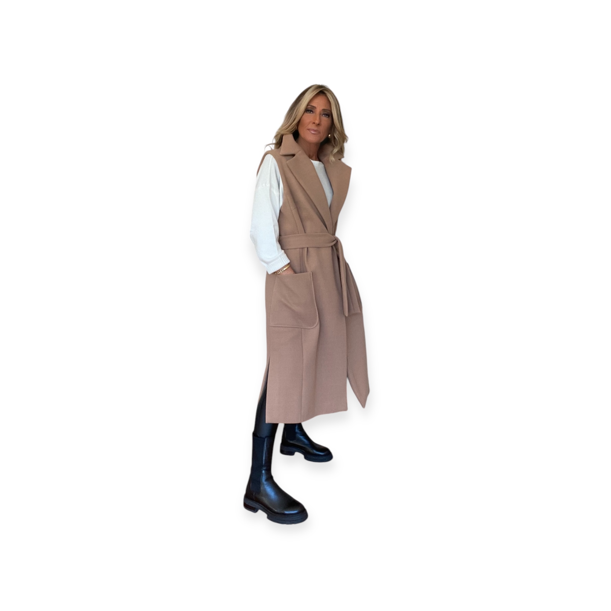 - Cappotto senza maniche con cintura in vita, ampie tasche applicate sul davanti