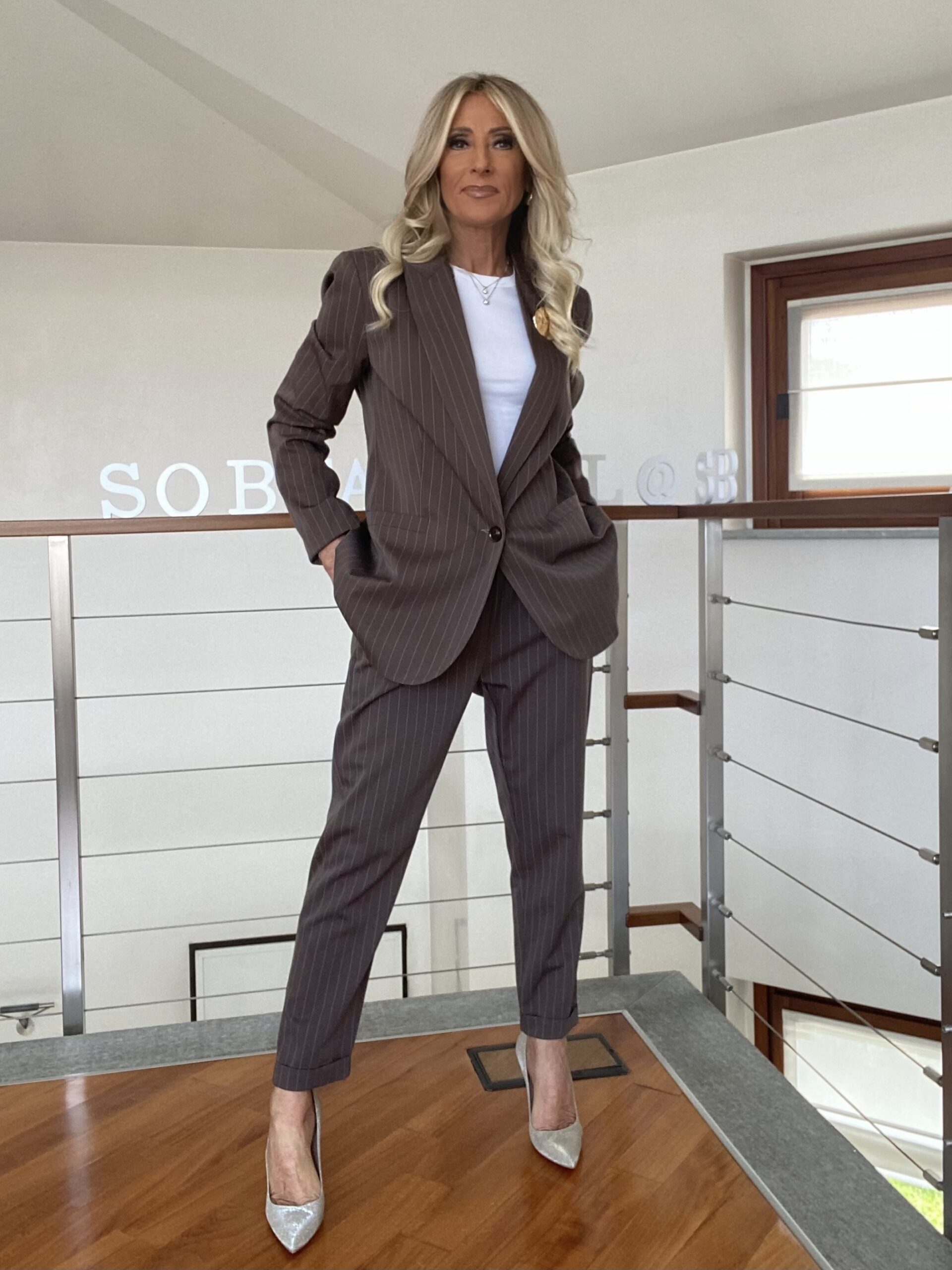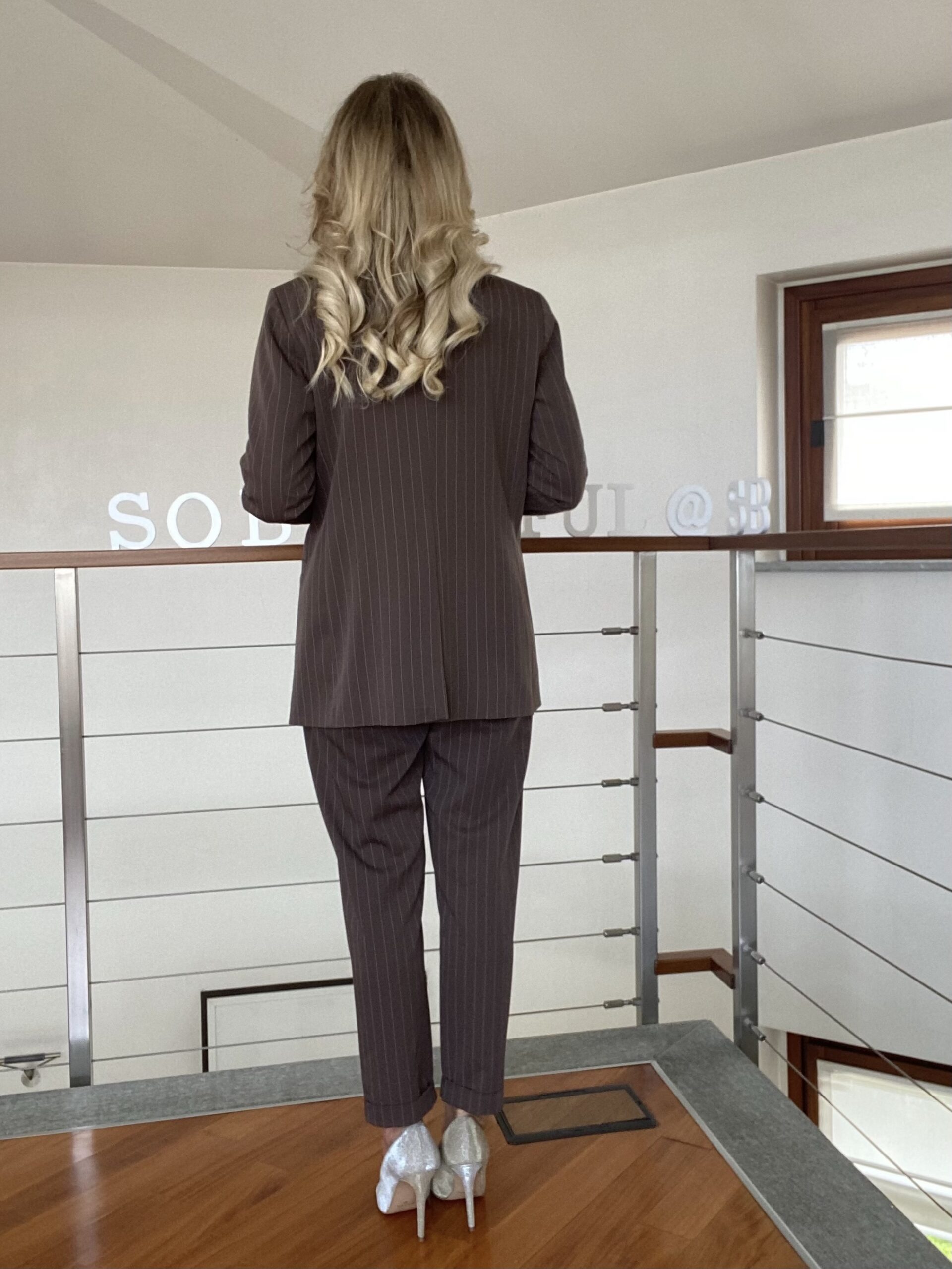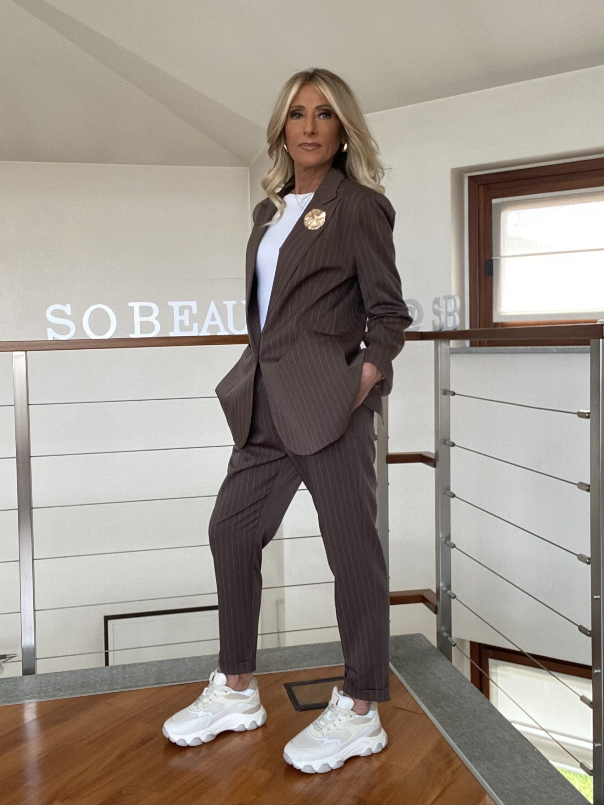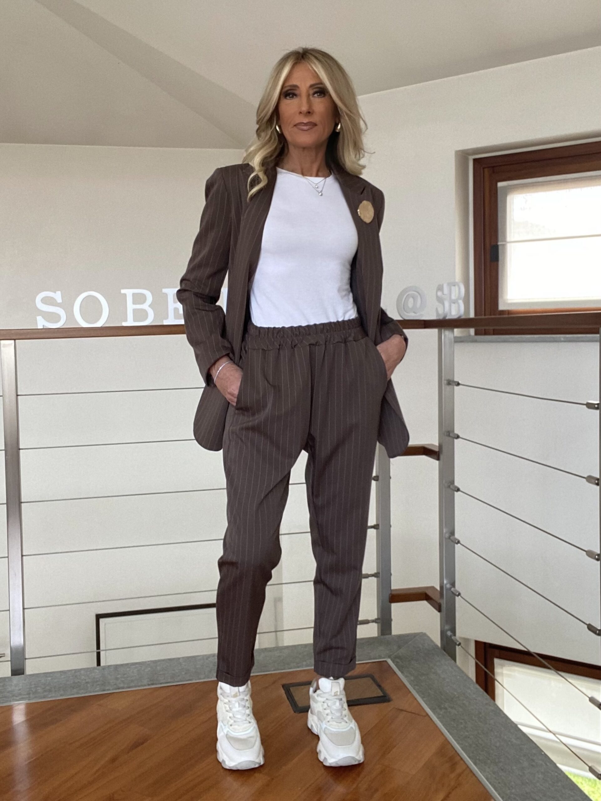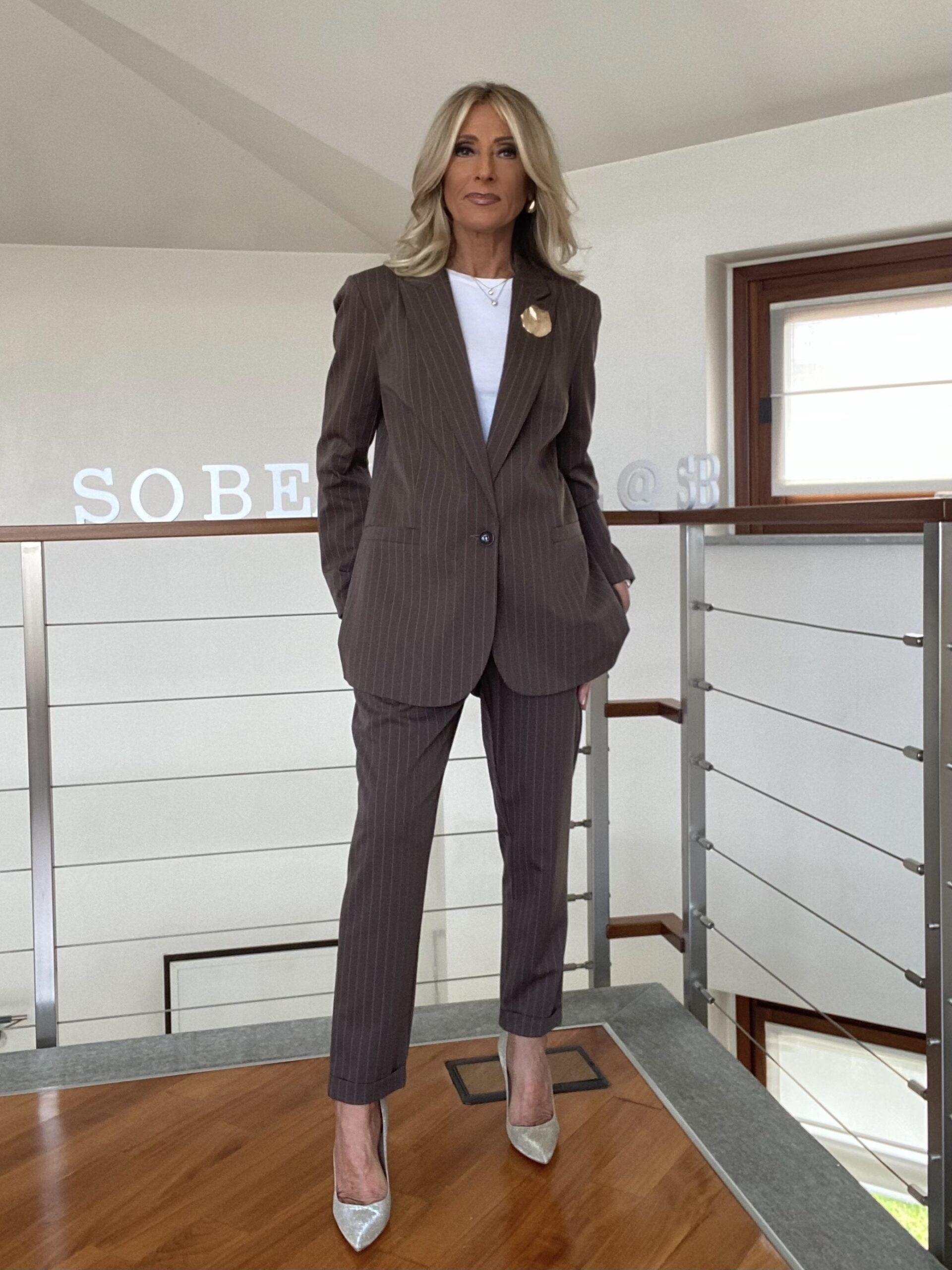 - Giacca e pantalone gessato. Blazer foderato con scollatura a lancia e spilla applicata, dalla linea leggermente over con spacco centrale sul retro. Pantalone gessato dalla linea morbida, tasche a filetto sul davanti, risvolto sul fondo, vita elasticizzata.