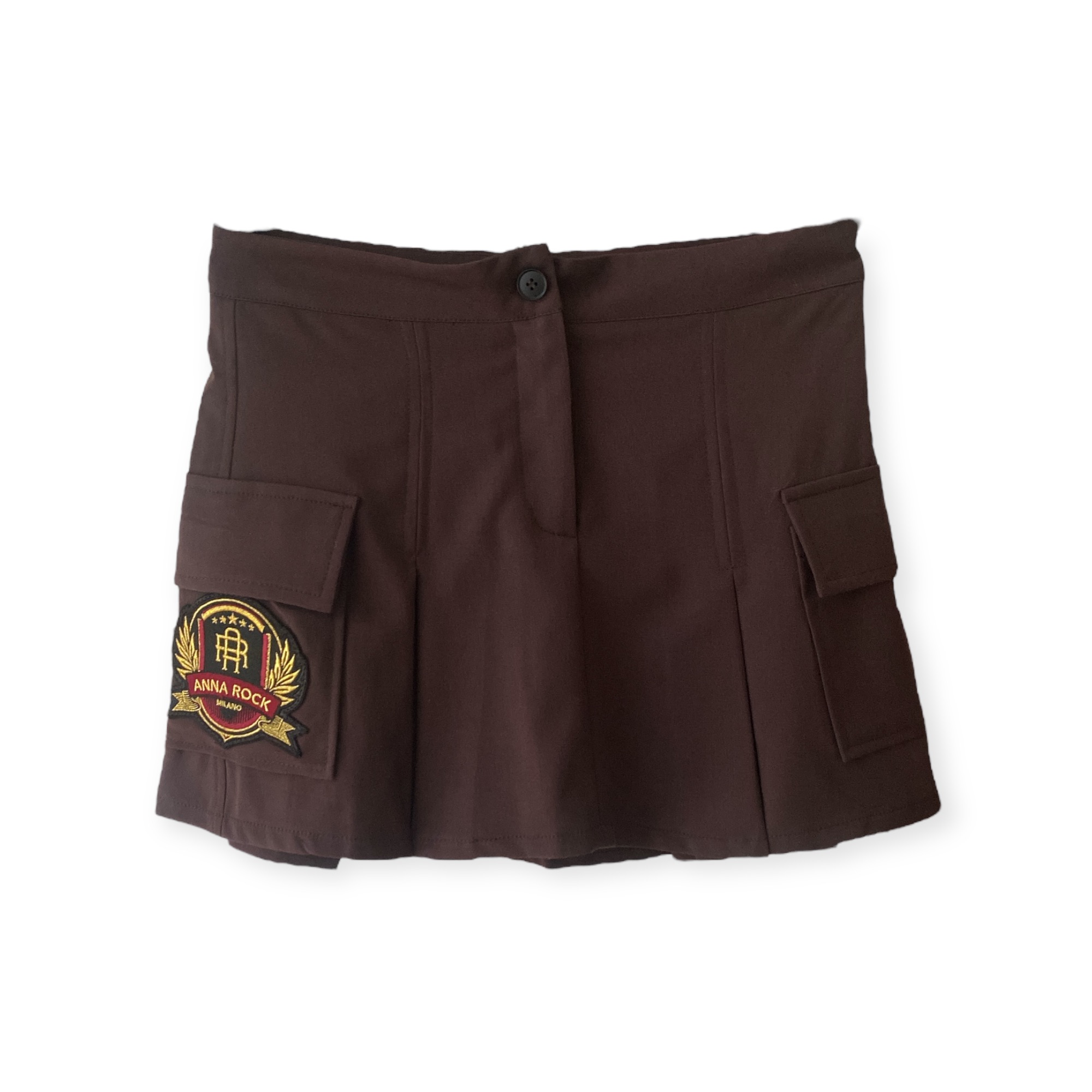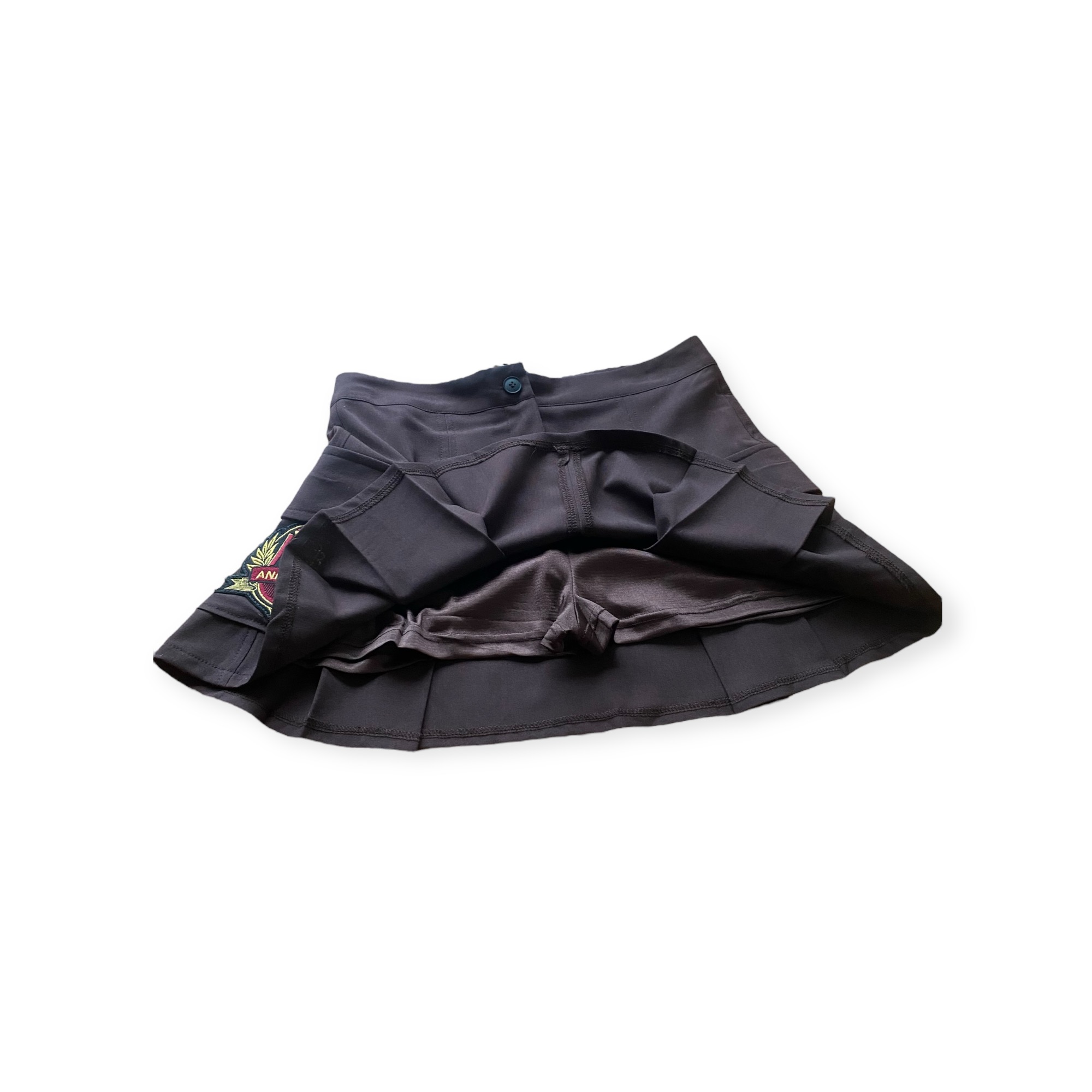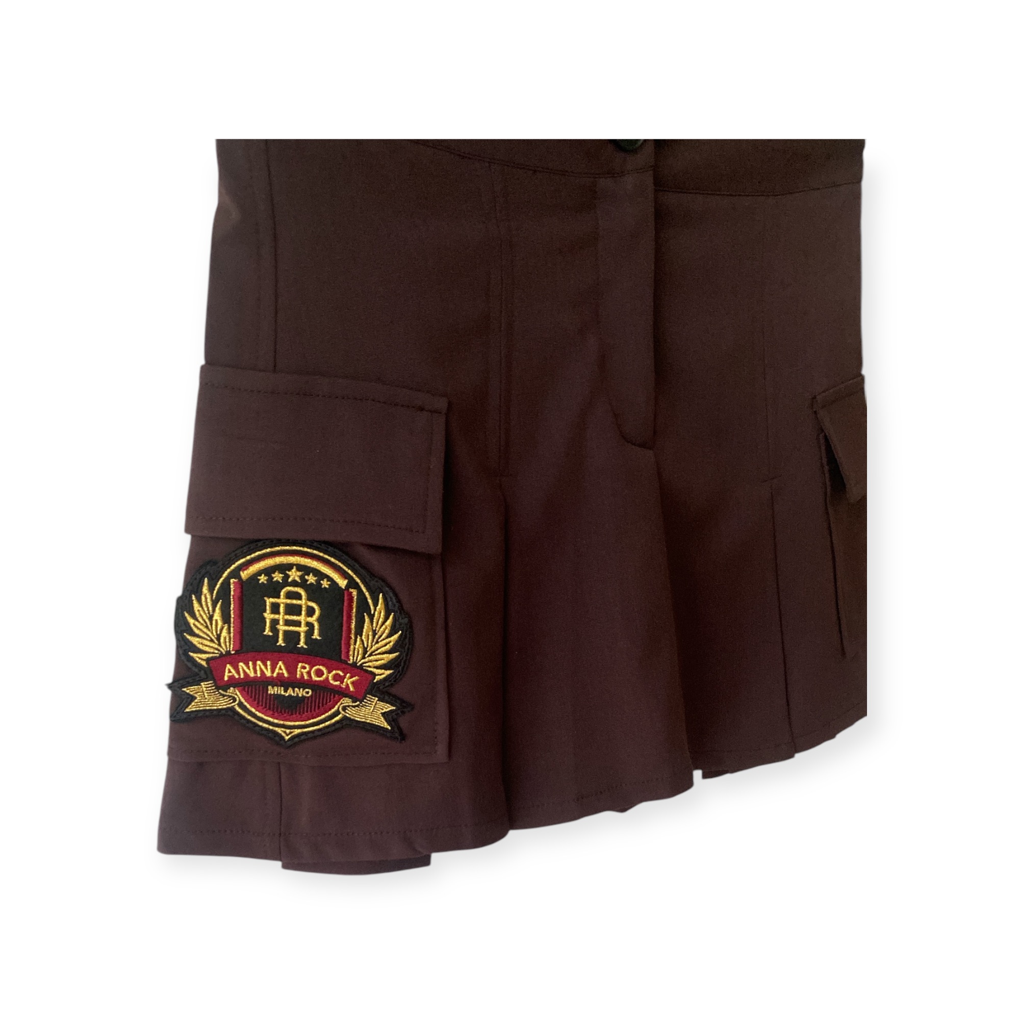 - Gonna corta con tasche applicate sui fianchi con logo Anna Rock Milano, sfondo piega davanti e dietro, pantaloncino interno elasticizzato