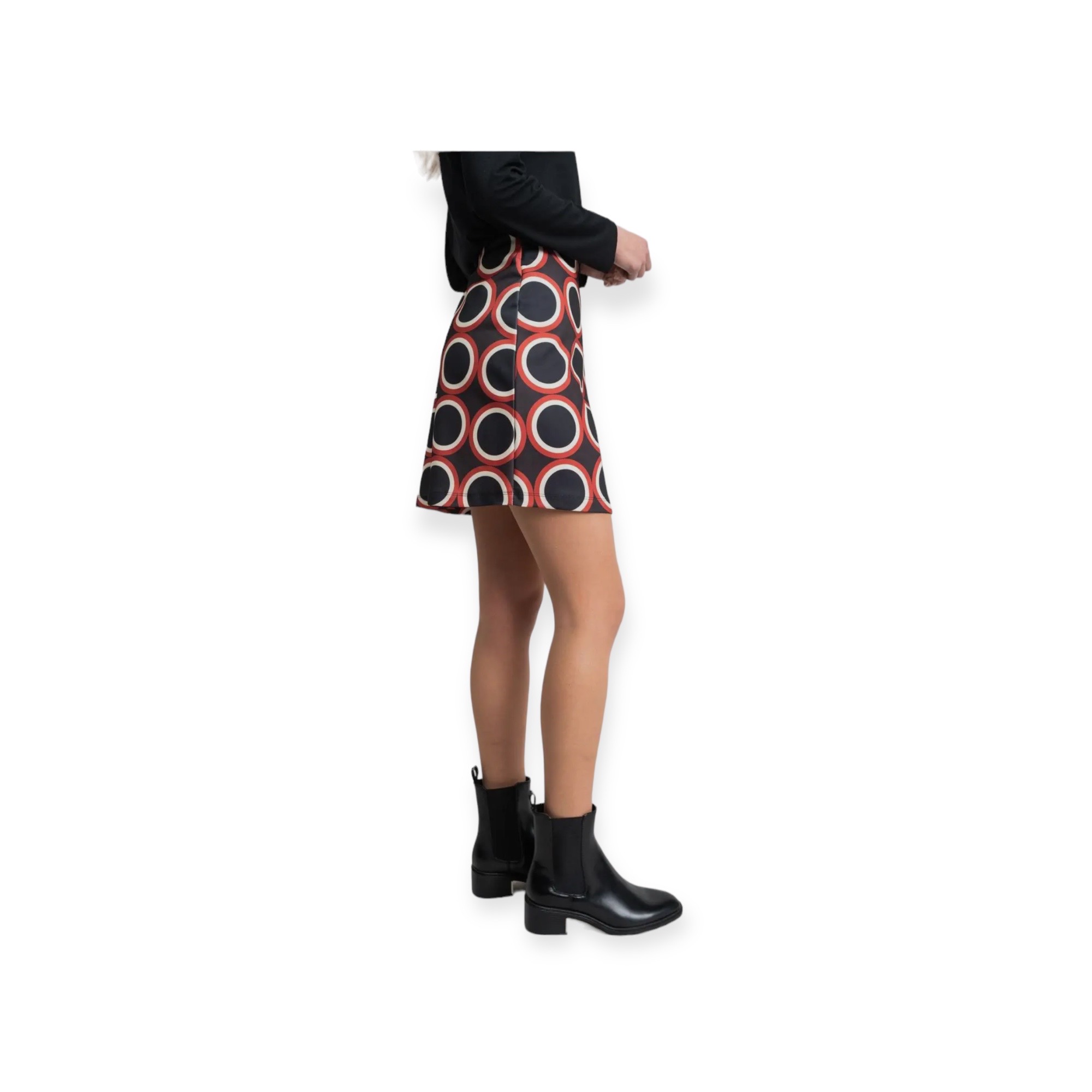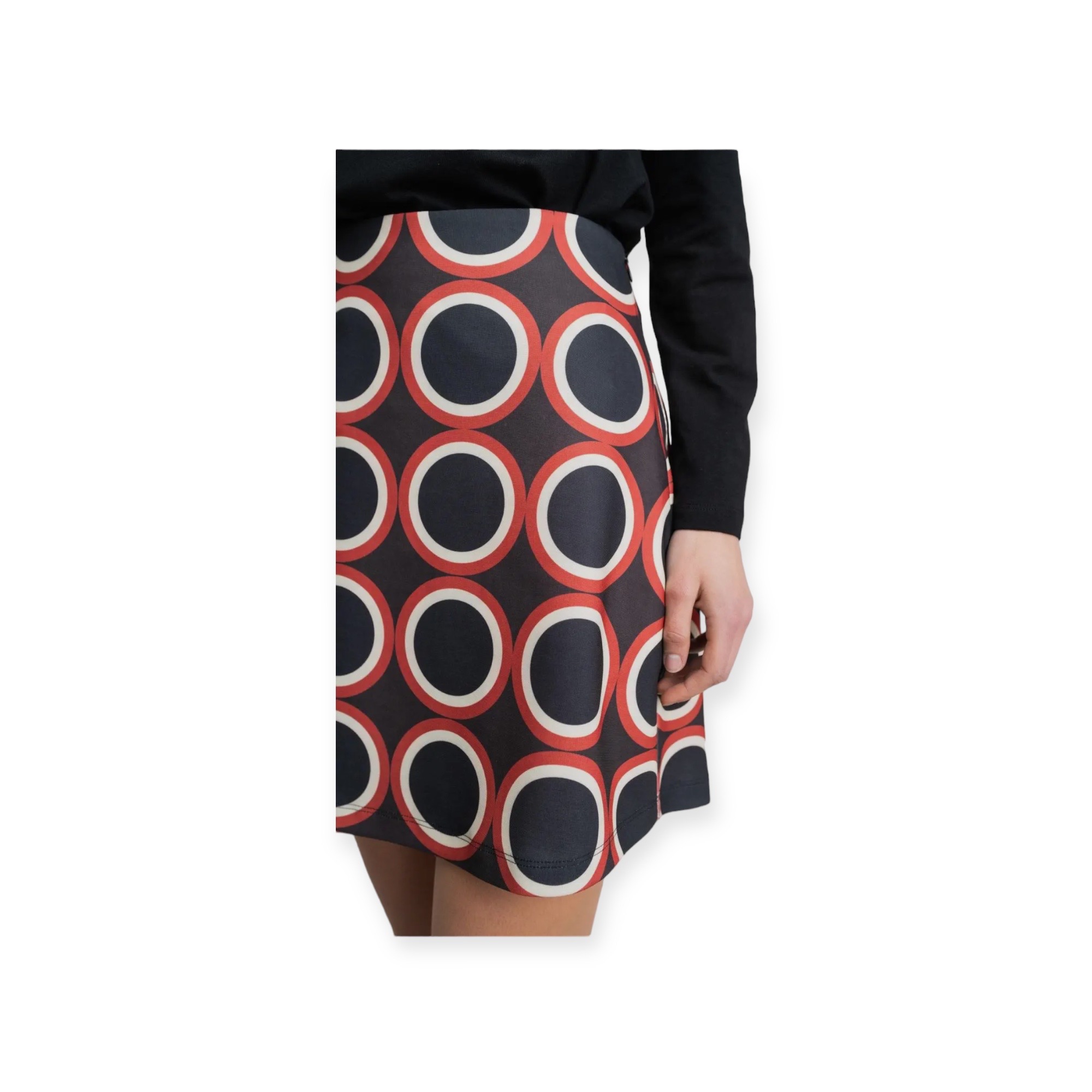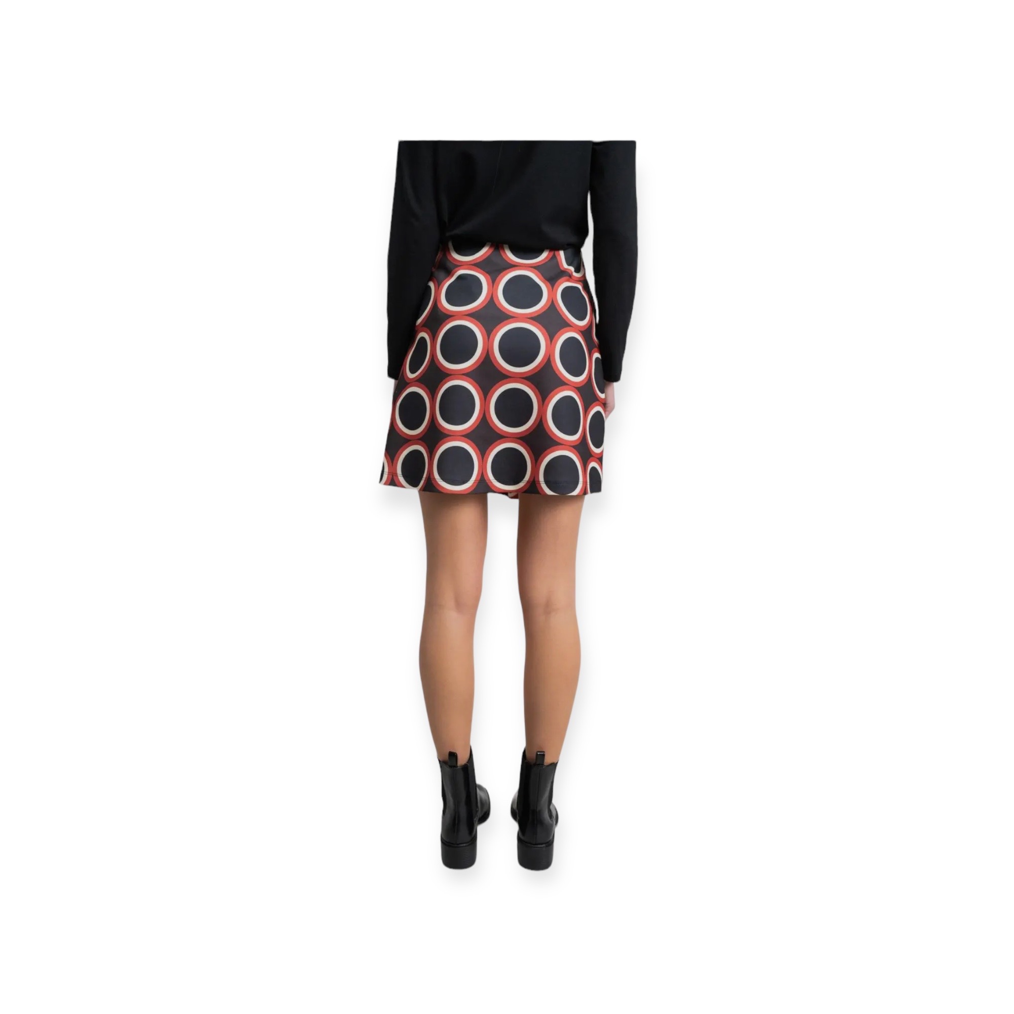 - Gonna corta svasata in jersey con stampa geometrica multicolore su sfondo nero con cerniera invisibile sul lato