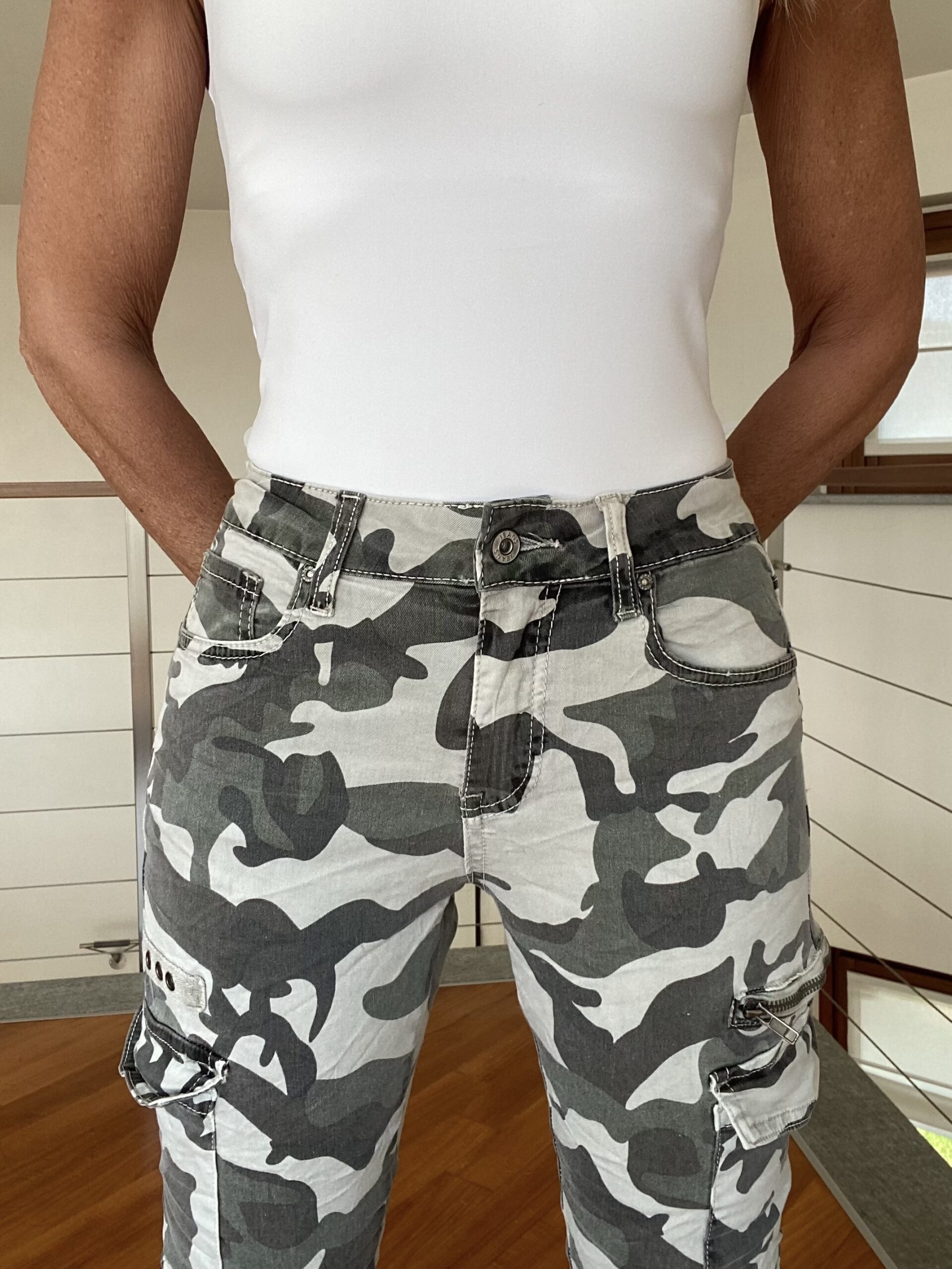 - Pantalone cargo in cotone stropicciato camouflage elasticizzato, modello cinque tasche con tasconi applicati sulle gambe, dalla vestibilità slim