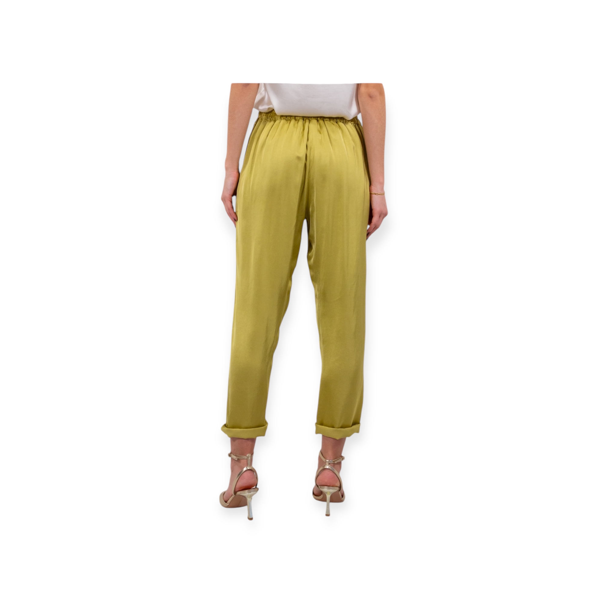 - Pantalone carrot in satin di viscosa a vita alta con tasche e elastico sul retro