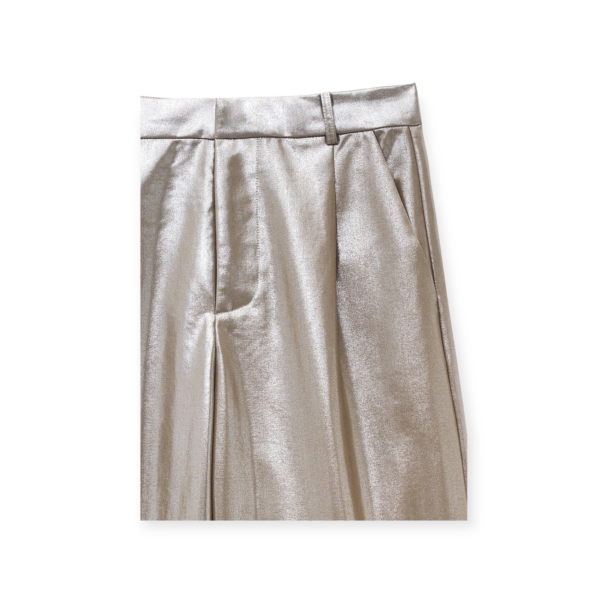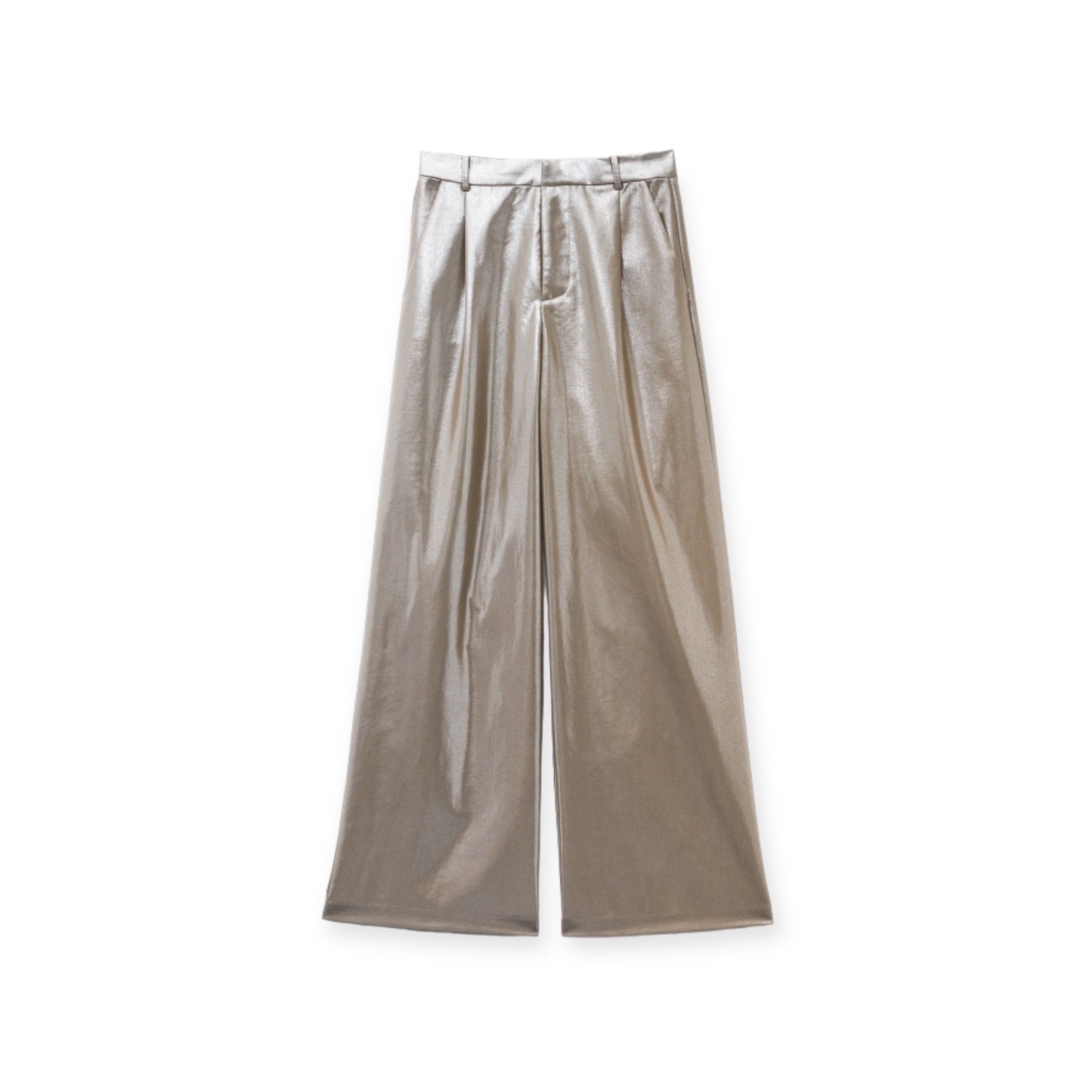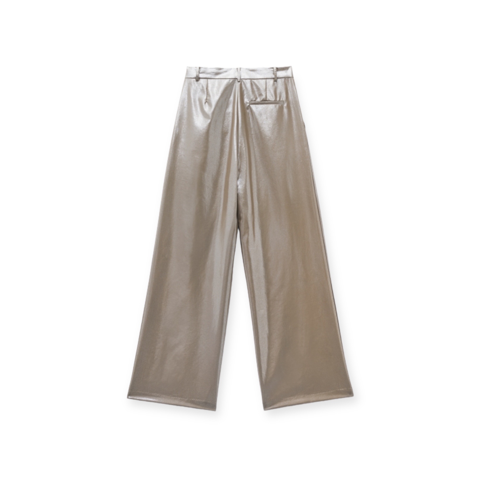 - Pantaloni realizzati in tessuto laminato effetto metallizzato. vita alta con passante, dettaglio di pinces anteriore, presenta tasche laterali e finte tasche posteriori, gamba larga