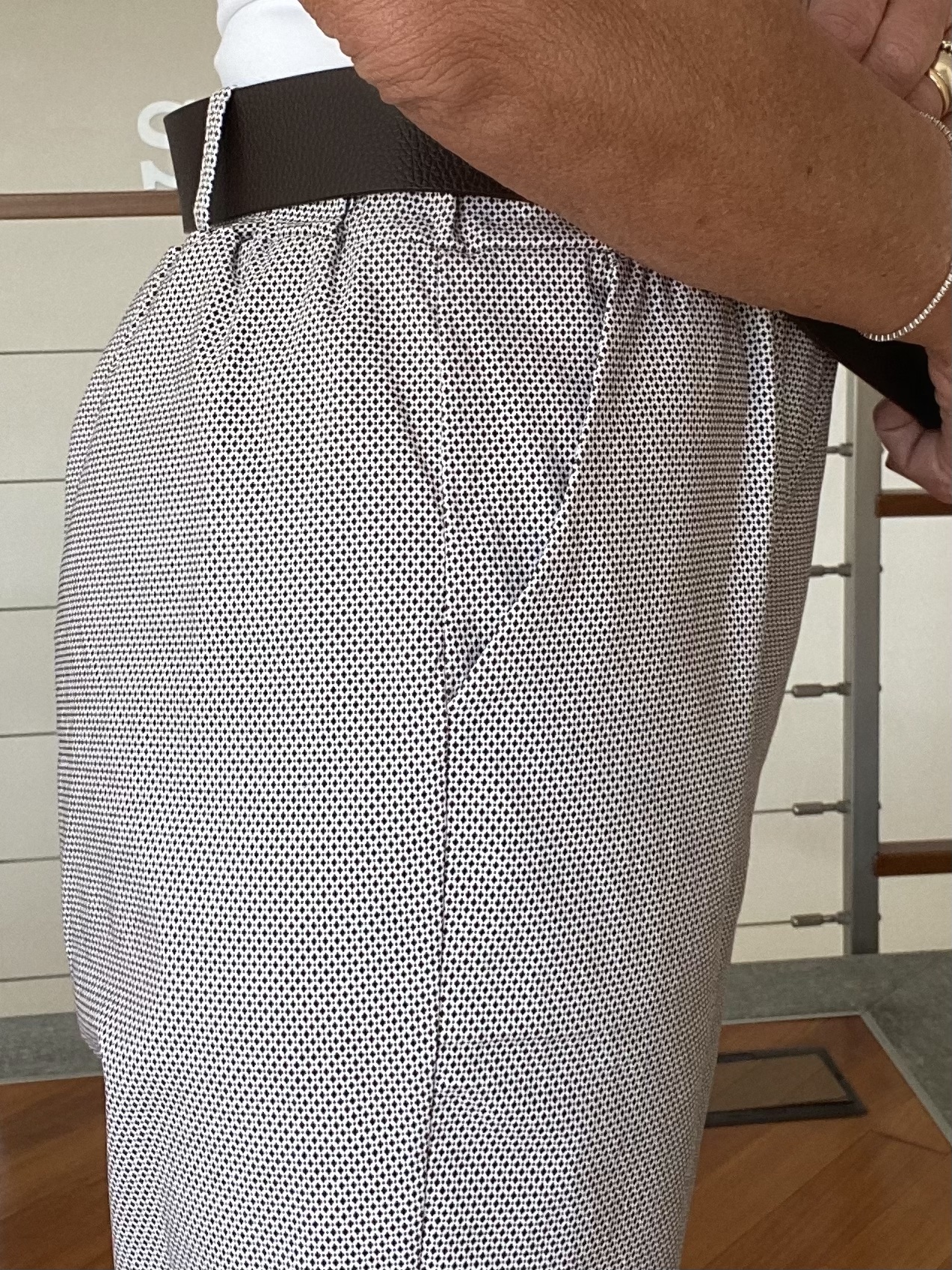 - Pantalone in viscosa elasticizzato a vita media con cintura in ecopelle, tasche a filetto sul davanti, a gamba morbida.