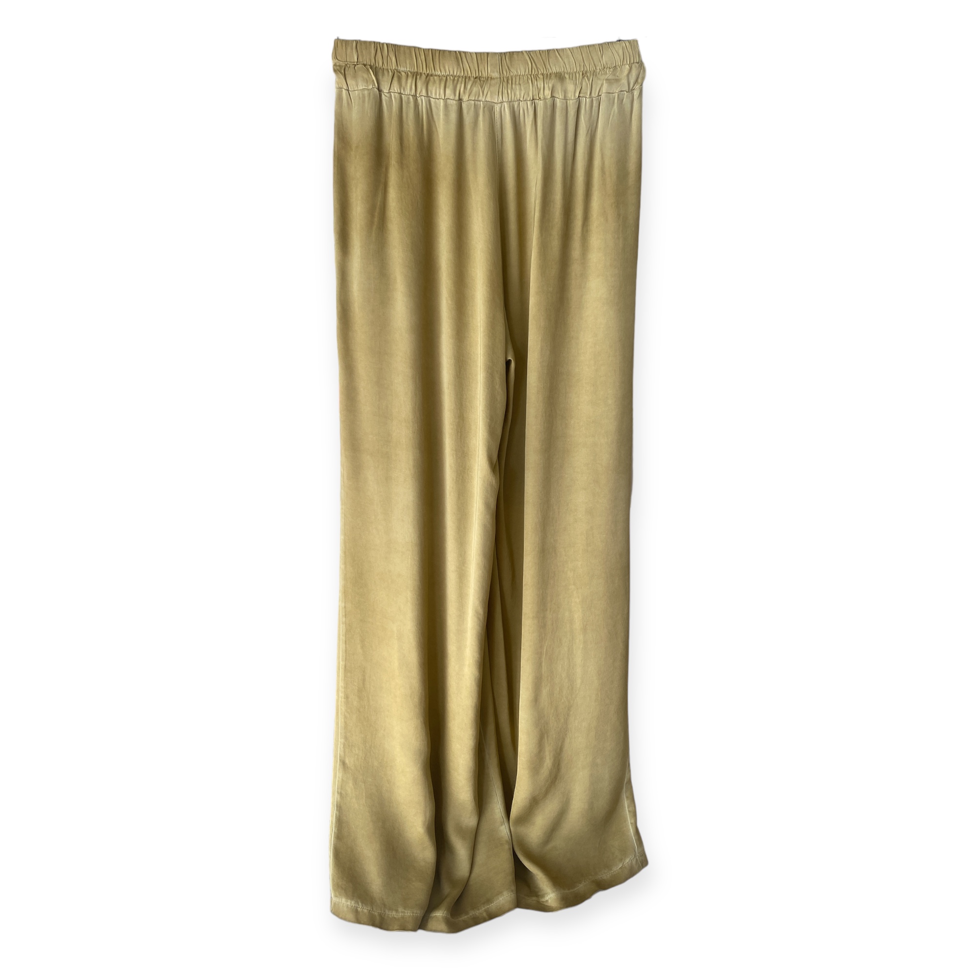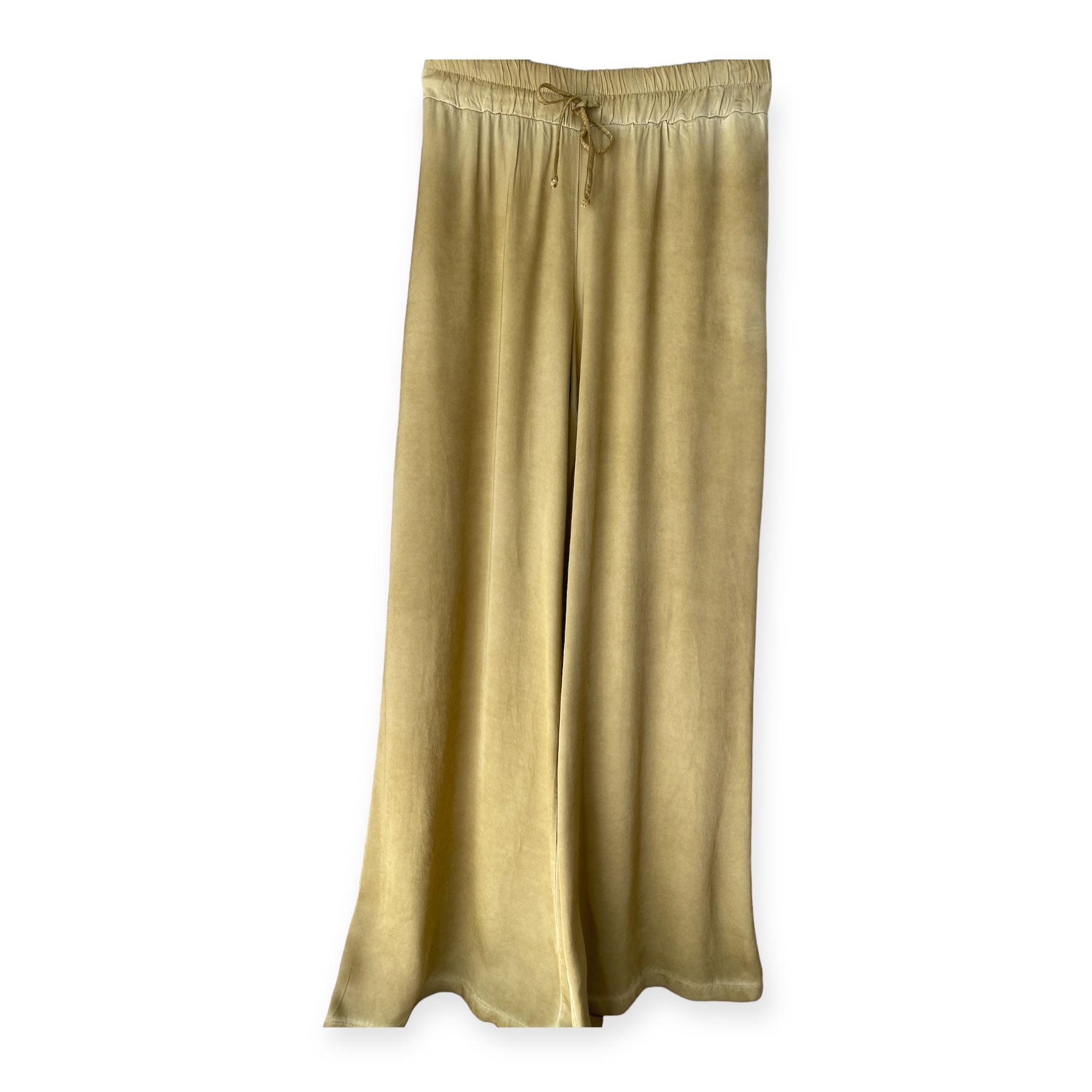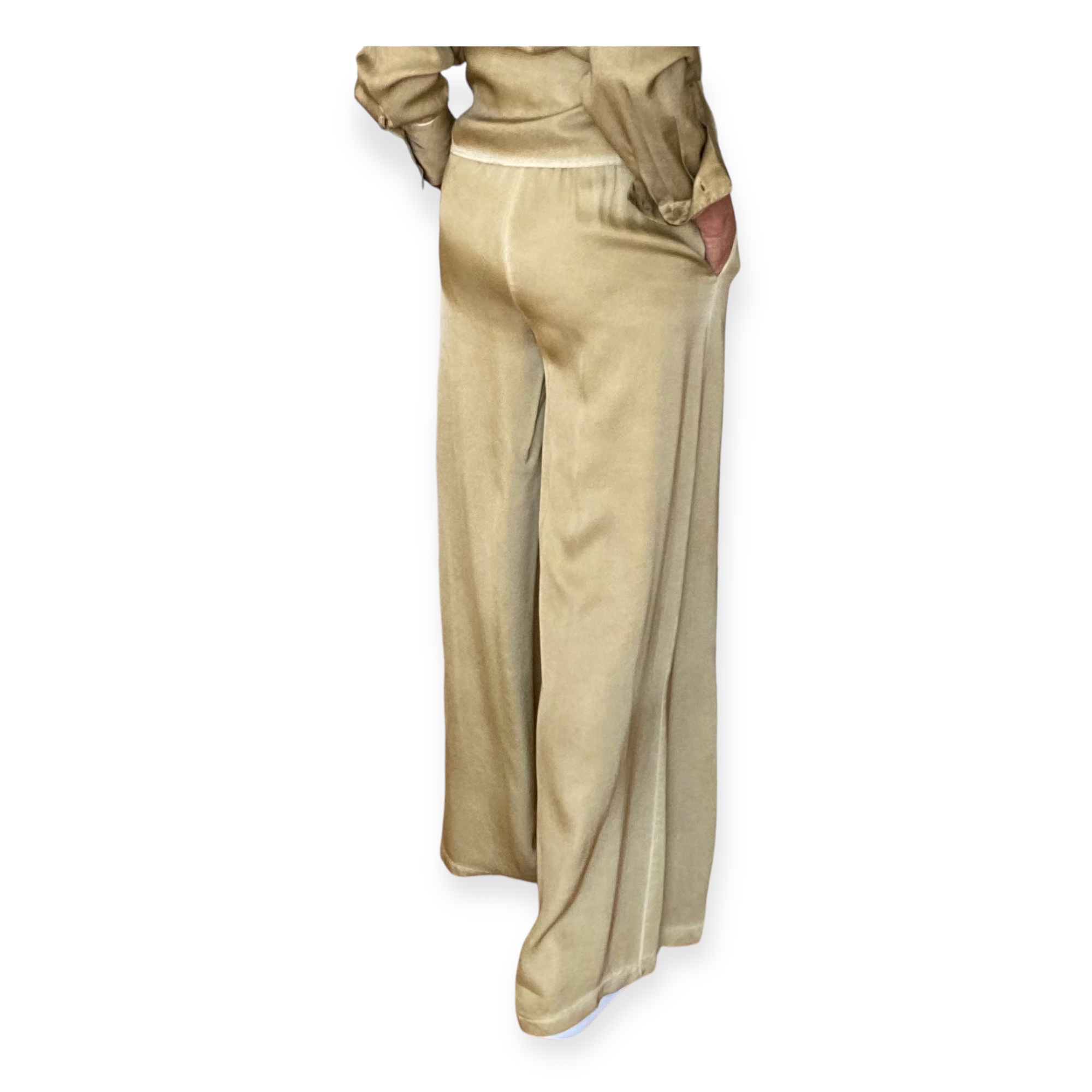 - Pantalone in raso tinto freddo con coulisse in vita dalla linea morbida