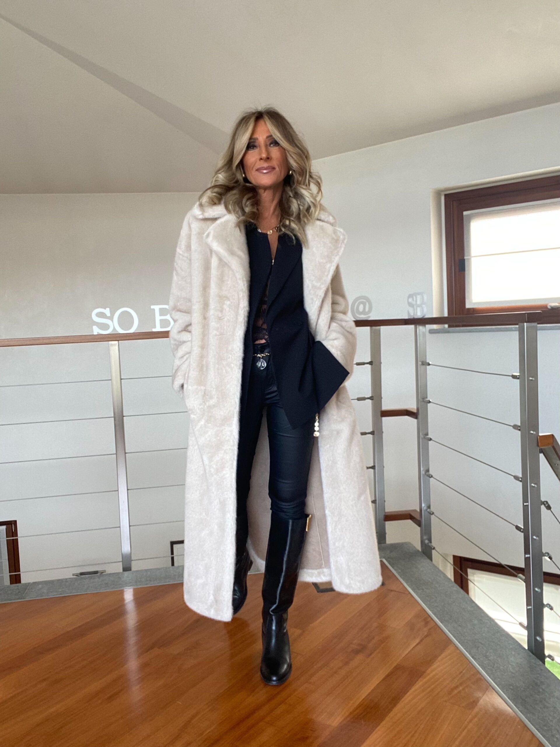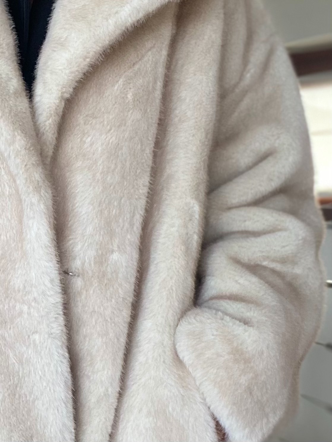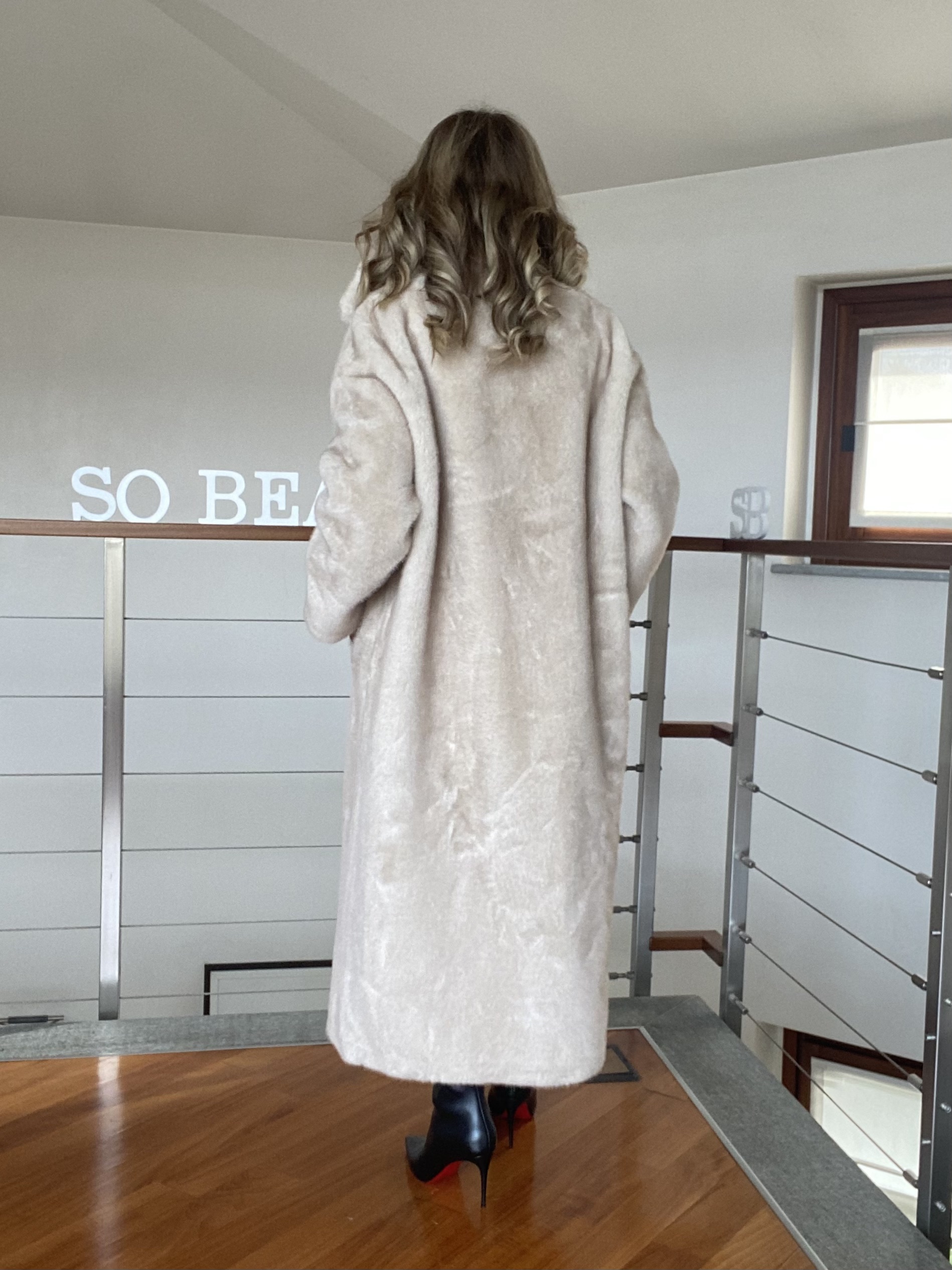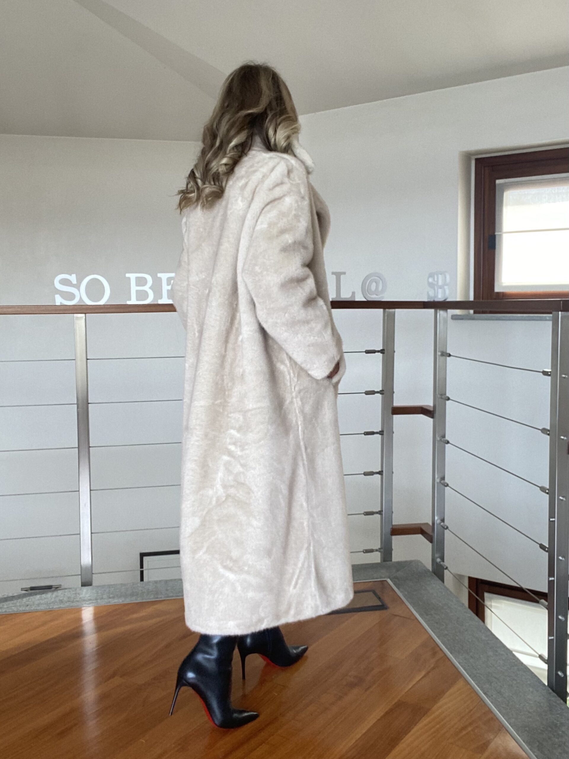 - Pelliccia lunga in visone ecologico dalla vestibilità over con ampio rever, chiusura a due ganci, tasche laterali a scomparsa