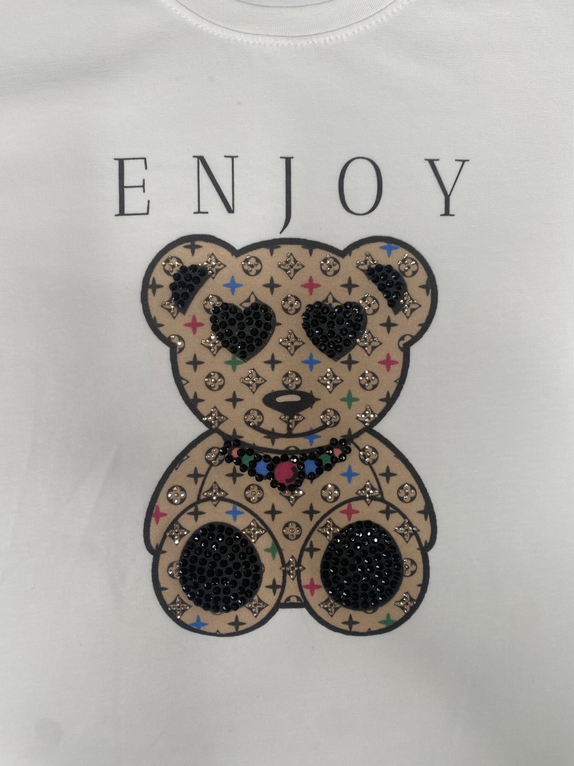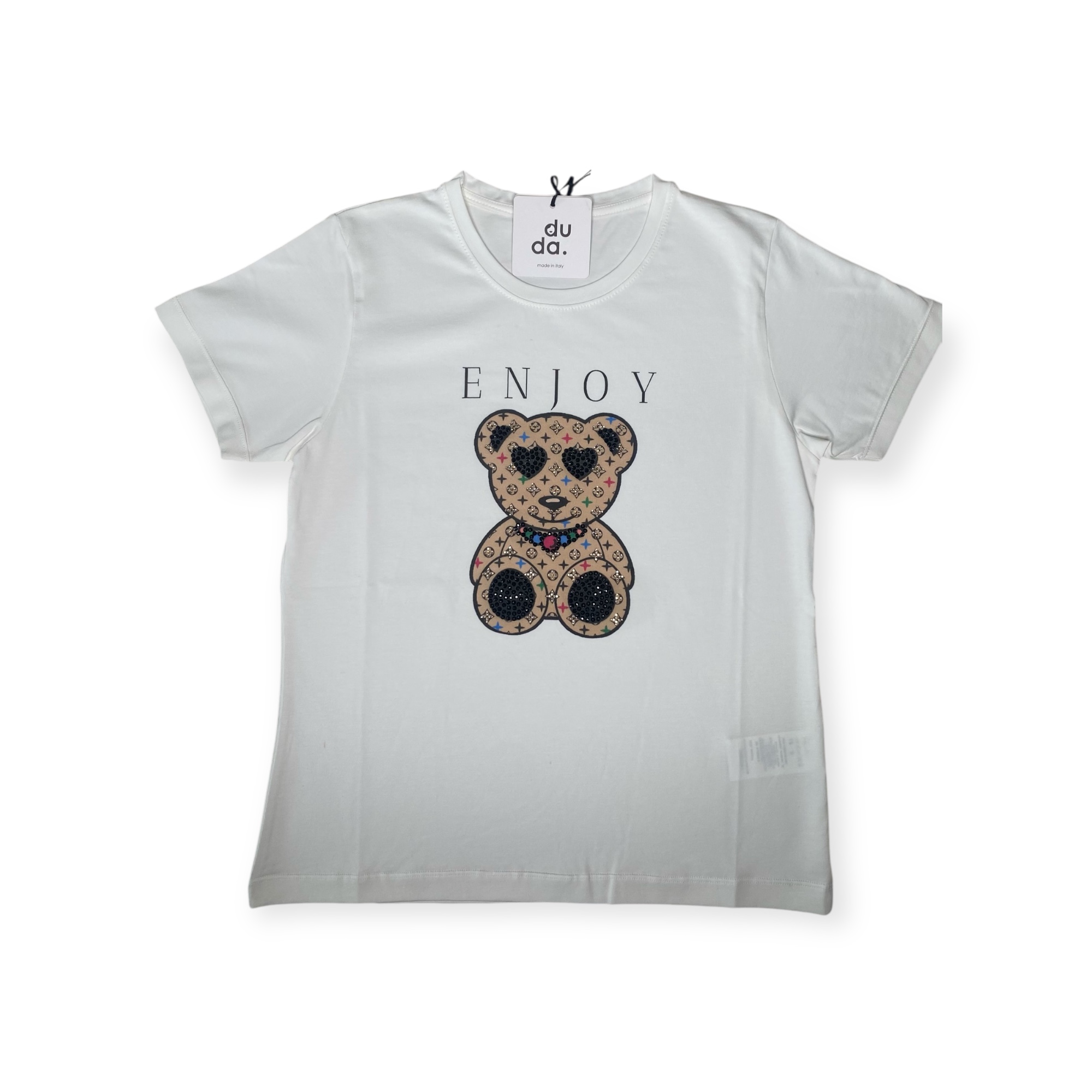 - T-shirt girocollo manica corta color panna con scritta e stampa teddy in strass sul davanti