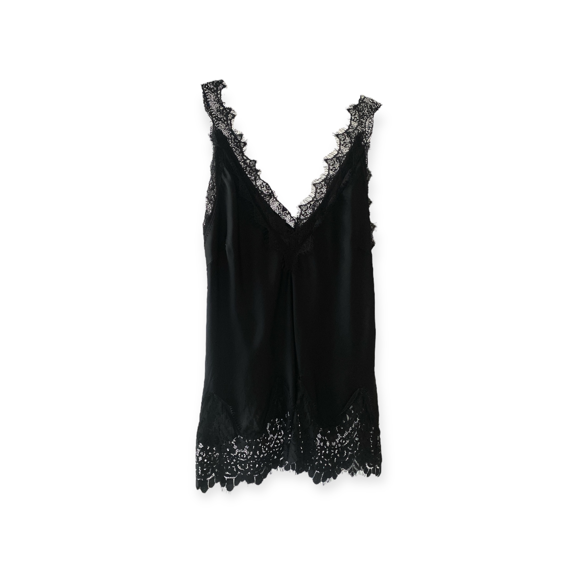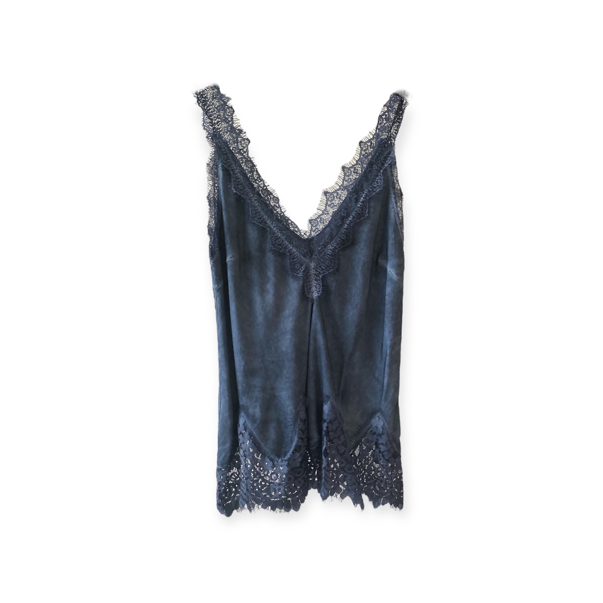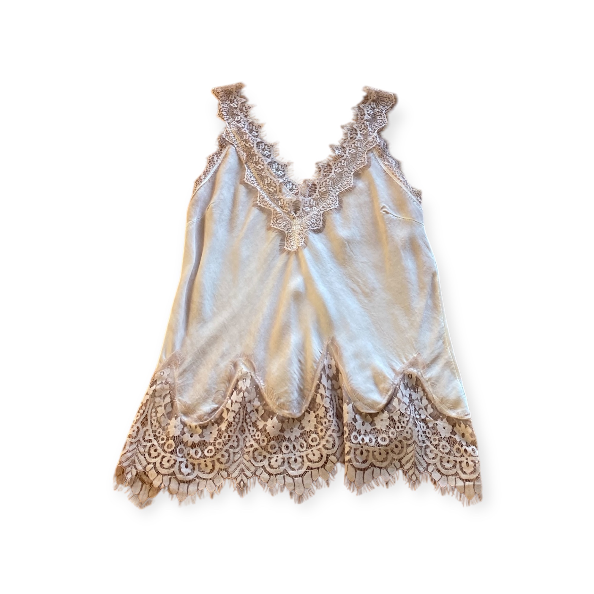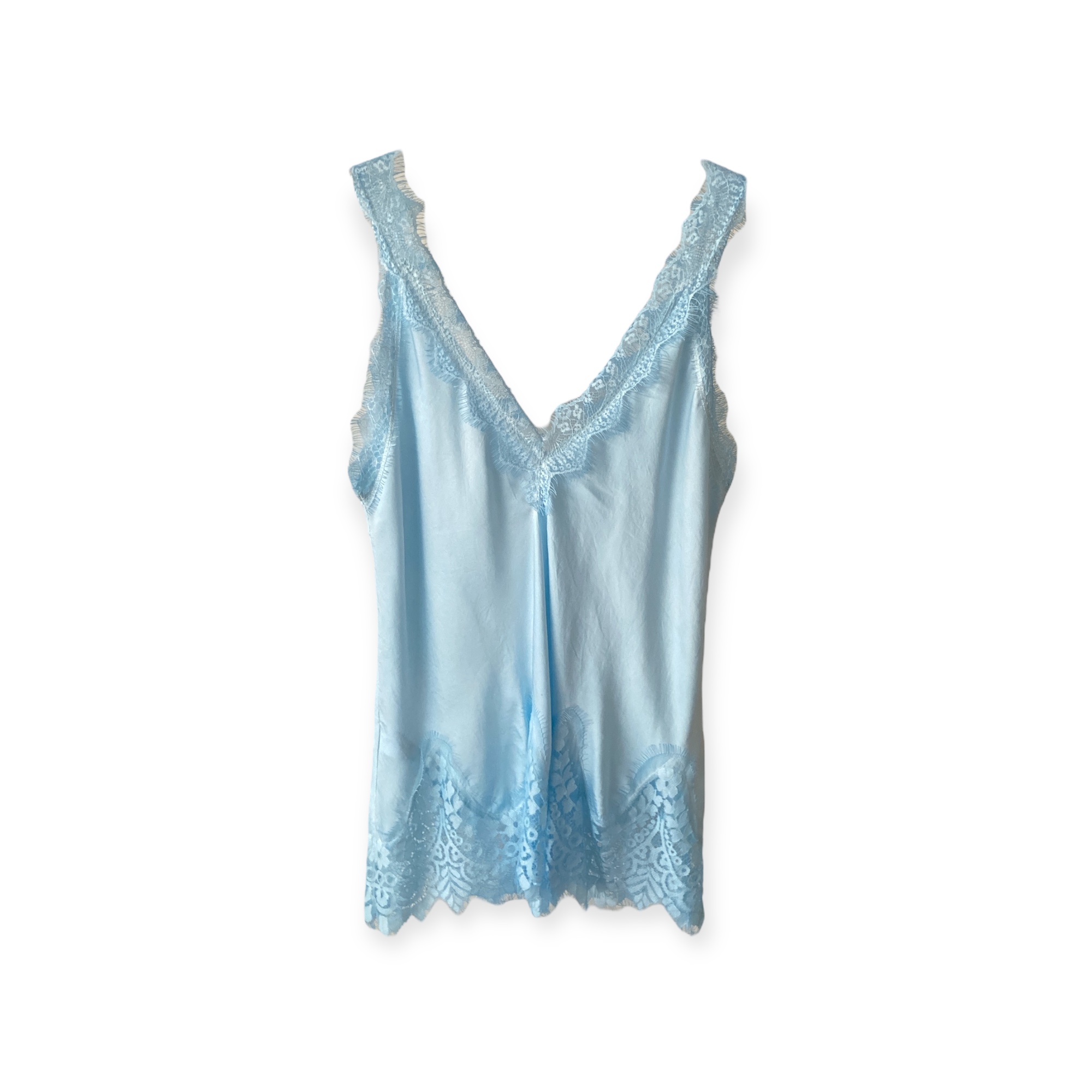 Top in satin effetto lavato con inserti in pizzo nella parte superiore e inferiore, scollato a V davanti e dietro