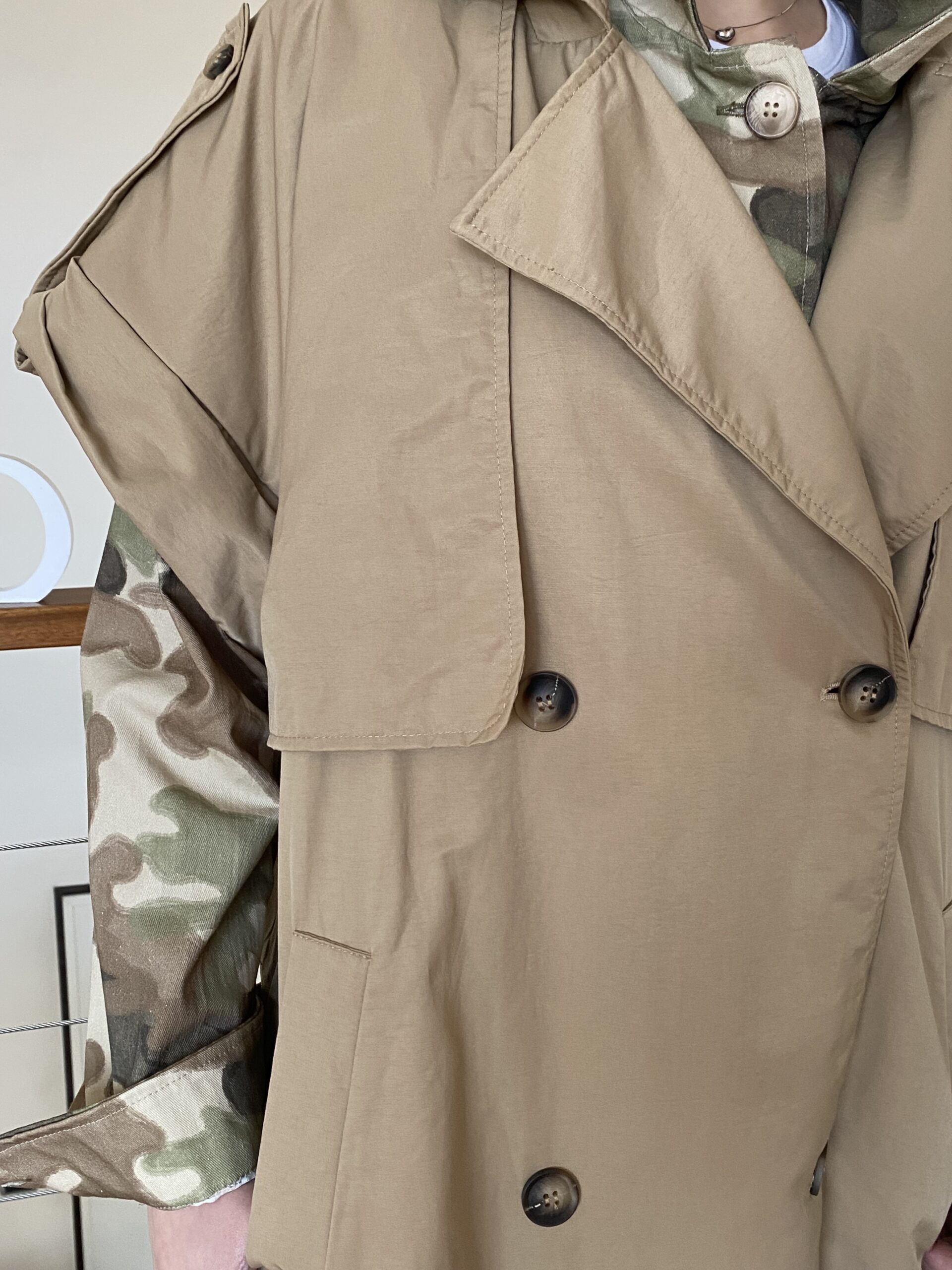 - Trench dalla linea over foderato senza maniche, spalla leggermente scesa con risvolto, ampio scollo rever doppiopetto, tasche sul davanti